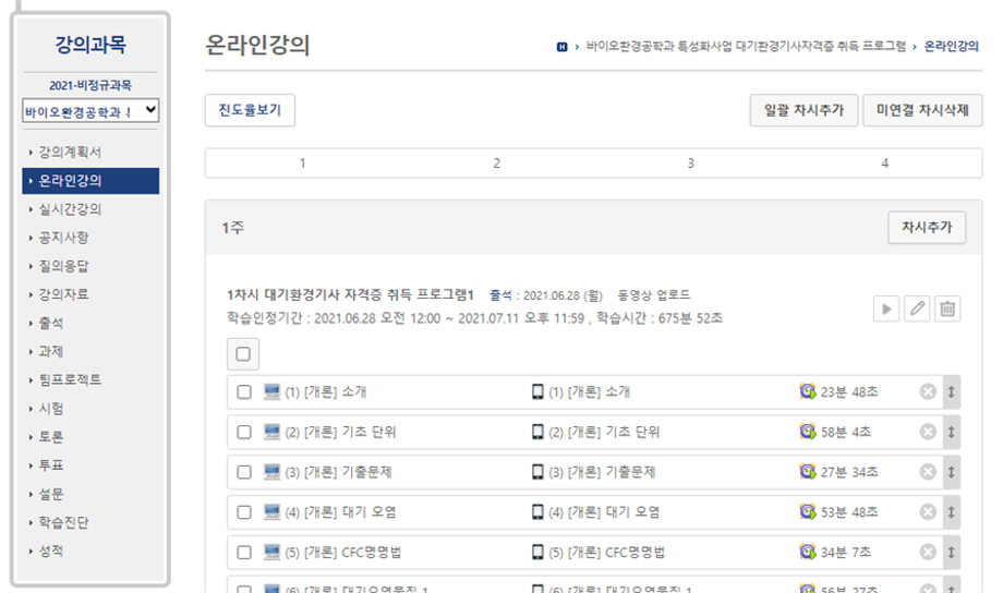 본문 시작 홈으로 학과과정 학과소개 교수소개 학과과정 커뮤니티 홈페이지가이드 비교과프로그램 교육과정 전공교육 체계도 졸업요건 비교과프로그램 특성화 환경기사자격증 취득 특성화 환경기사자격증 취득 환경기사자격증 멘토링 시스템 환경기사자격증 단기실무 학과 특성화 포인트 제도 대학혁신지원Creative Cube 특성화 환경기사자격증 취득 페이스북 트위터 프린트 2021학년도 특성화 환경기사 자격증 취득 프로그램 시행 바이오환경공학과 3579 2022-01-26 2021학년도 특성화 환경기사 자격증 취득 프로그램을 하계 방학동안 비대면으로 실시하였습니다. 본 프로그램을 통해 재학생들이 환경기사 자격증을 취득하며 진로 의사결정에 도움이 되었으면 좋겠습니다! 다음 학년도에도 많은 관심과 참여 해주시고 자격증 취득을 기원합니다! 목록 이전특성화 환경기사 자격증 프로그램 담당부서 : 환경에너지학과 담당자 : - 연락처 : 043-649-1337 최종수정일 : 2024-10-26 만족도조사 만족도 조사 이 페이지에서 제공하는 정보에 대하여 만족하시나요? 매우만족 만족 보통 불만족 매우불만족