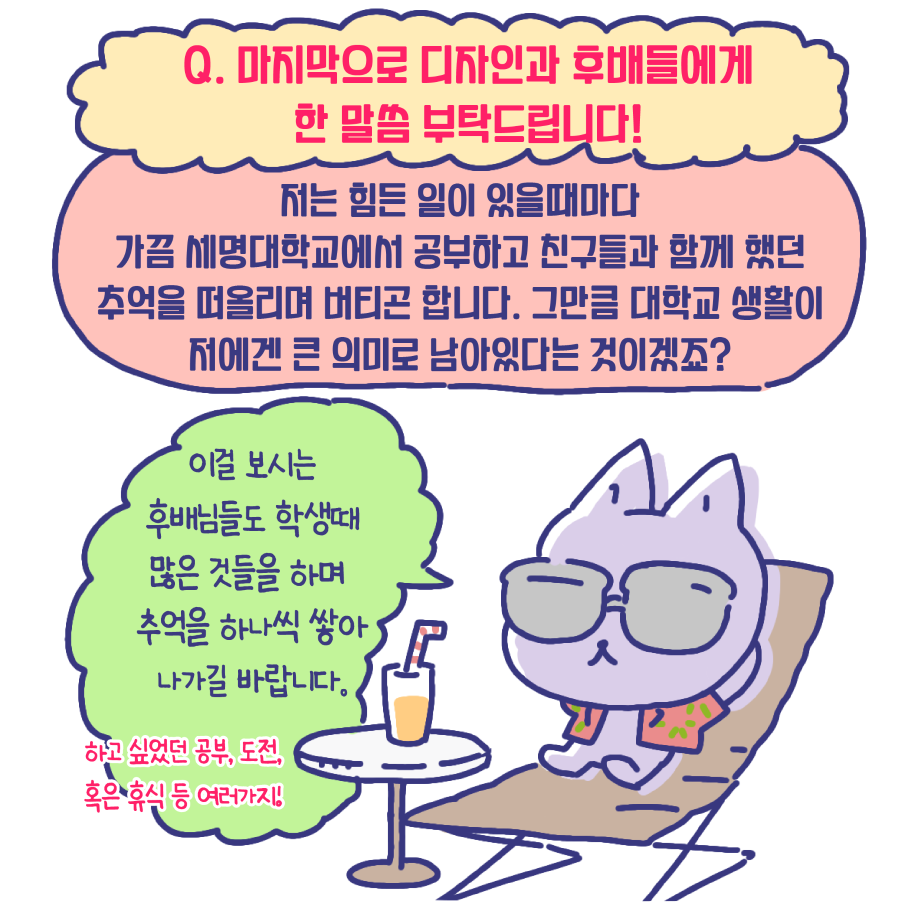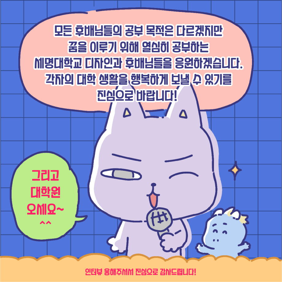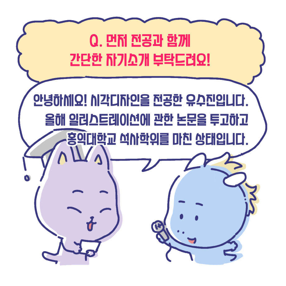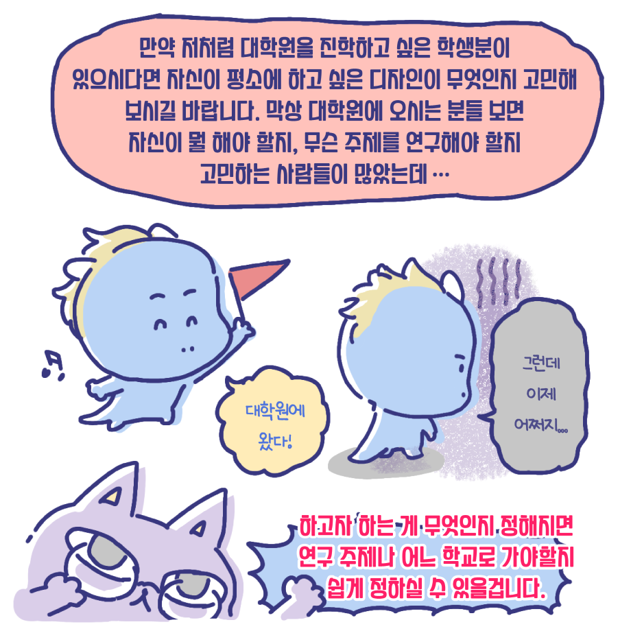 본문 시작 홈으로 입학/취업 학과소개 학과과정 시영소식 입학/취업 AI 학과자랑 SNS소통 홈페이지가이드 취업지금 입학여기 취업지금 전공소개 취업지금 페이스북 트위터 프린트 취업사례 중 대학원 진학 편 시각영상디자인학과 2381 2023-07-17 졸업생 중, 대학원 진학자 편입니다. 유수진 선배이며, 금년 2월에 홍익대학교 대학원을 졸업하였습니다. 인터뷰 및 웹툰 제작은 3학년 전희진 학생이 진행하였습니다. 목록 이전시각영상디자인학과 윤지훈 졸업생 - 가산디지털단지 디자인회사 취업! 다음 게임 레벨 디자이너 - 15학번 전상필 졸업생 담당부서 : 시각영상디자인학과 담당자 : - 연락처 : 043-649-1726 최종수정일 : 2024-10-26 만족도조사 만족도 조사 이 페이지에서 제공하는 정보에 대하여 만족하시나요? 매우만족 만족 보통 불만족 매우불만족