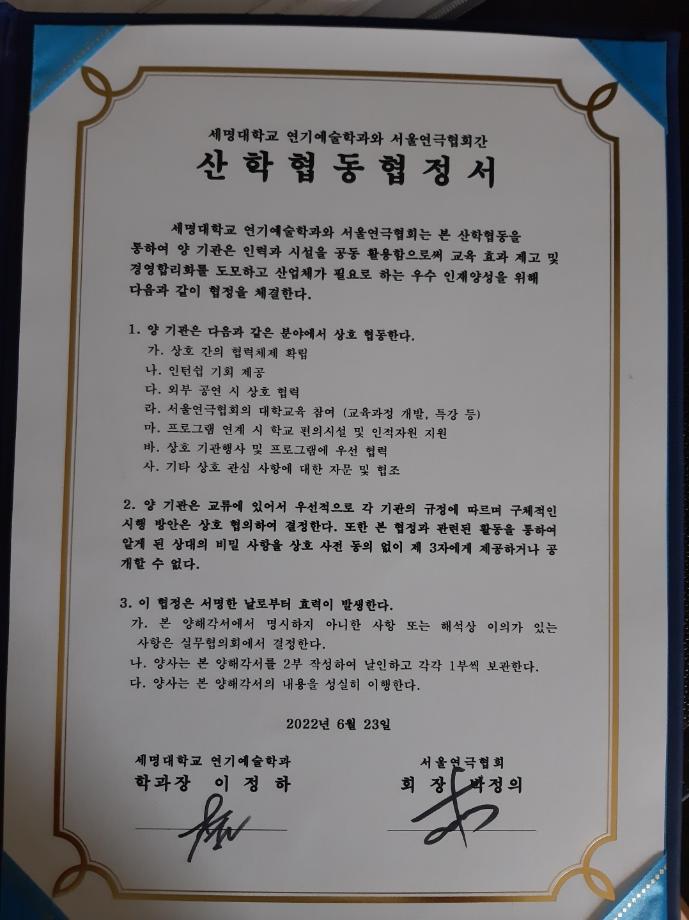 본문 시작 홈으로 학과과정 학과소개 입학정보 교수소개 학과과정 커뮤니티 공연예매 안내 홈페이지가이드 MOU 체결 교육과정 전공교육 체계도 비교과프로그램 MOU 체결 MOU 체결 페이스북 트위터 프린트 세명대학교 연기예술학과 서울연극협회 산학 협동 협정서 연기예술학과 2992 2022-07-12 목록 이전세명대학교 (전방송연예학과와) (현 연기예술학과) 극단 이유 산학 협동 협정서 다음 세명대학교 연기예술학과, 극단 명작옥수수밭과 산학협력협약(MOU) 체결 만족도조사 만족도 조사 이 페이지에서 제공하는 정보에 대하여 만족하시나요? 매우만족 만족 보통 불만족 매우불만족