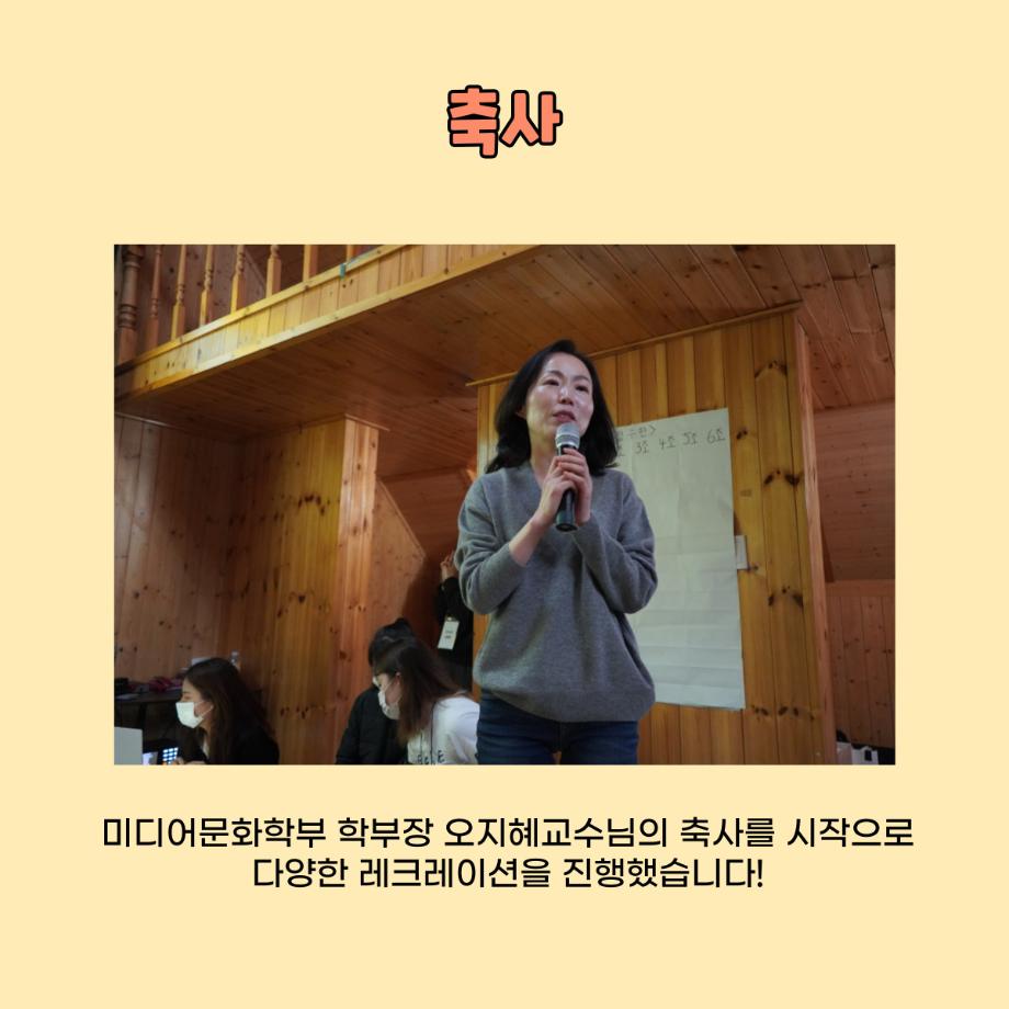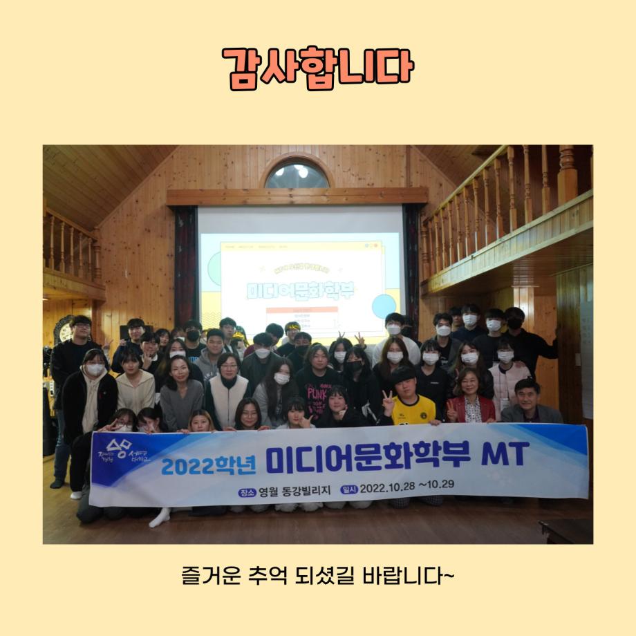 본문 시작 홈으로 학부소식 학부소개 교육과정 학부소식 커뮤니티 홈페이지가이드 미문한컷 공지사항 학사일정 학부행사 미문뉴스 미문한컷 포토갤러리 미문한컷 페이스북 트위터 프린트 미문 한 컷 | 열여섯 번째 이야기 미디어문화학부 1758 2022-11-17 미디어문화학부가 코로나19이후 3년 만에 영월 동강 빌리지로 MT를 갔다 왔습니다😎 10월 28일 (금) 모두 떨리는 마음으로 버스를 타고 세명대학교에서 출발하여 영월에 도착 후 짐을 풀고 맛있는 저녁식사를 하고 이후 교수님의 축사를 시작으로 다양한 레크리에이션 진행하였으며 레크리에이션 이후 잘 마무리하고 10월 29일 (토) 세명대학교에 잘 도착하였습니다. 앞으로 더 재미있는 MT를 진행하기 위해 노력하겠습니다! 감사합니다. 목록 이전미문 한 컷 | 열다섯 번째 이야기 다음 미문 한 컷 | 열일곱 번째 이야기 만족도조사 만족도 조사 이 페이지에서 제공하는 정보에 대하여 만족하시나요? 매우만족 만족 보통 불만족 매우불만족