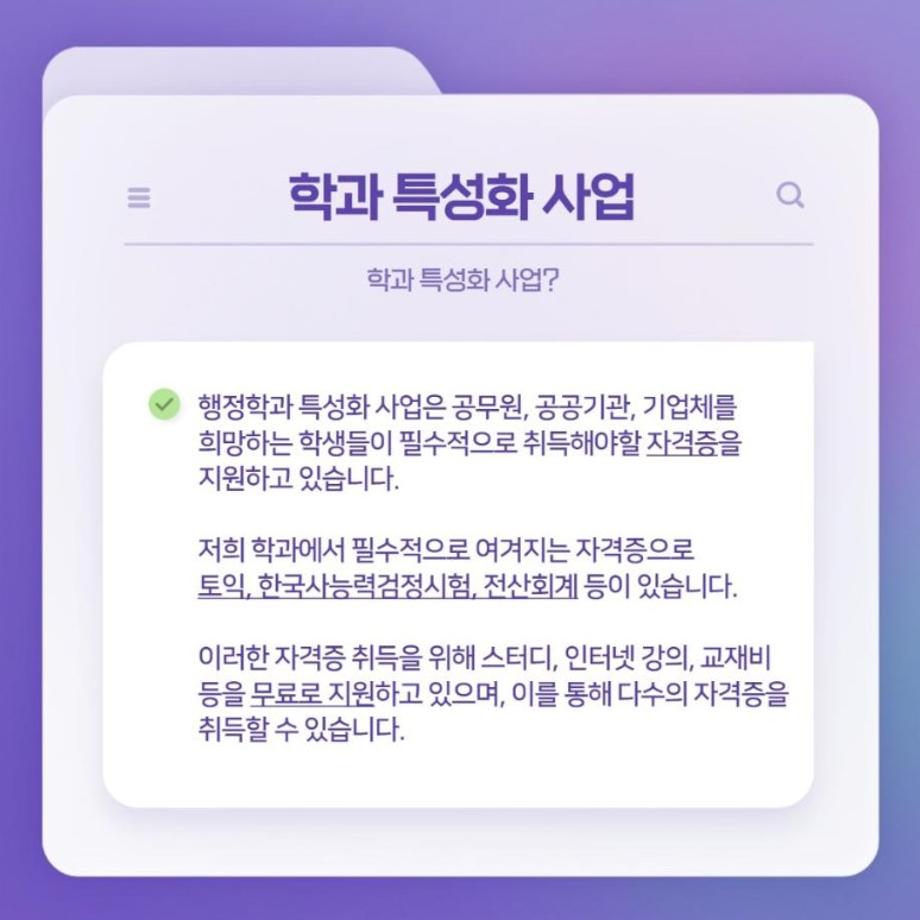 4️⃣ '학과 특성화 사업'은 학생들의 자격증 취득을 위해 스터디, 인터넷 강의, 교재비 등을 무료로 지원하는 행정학과만의 특성화 사업입니다.