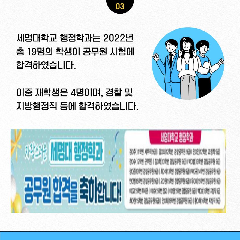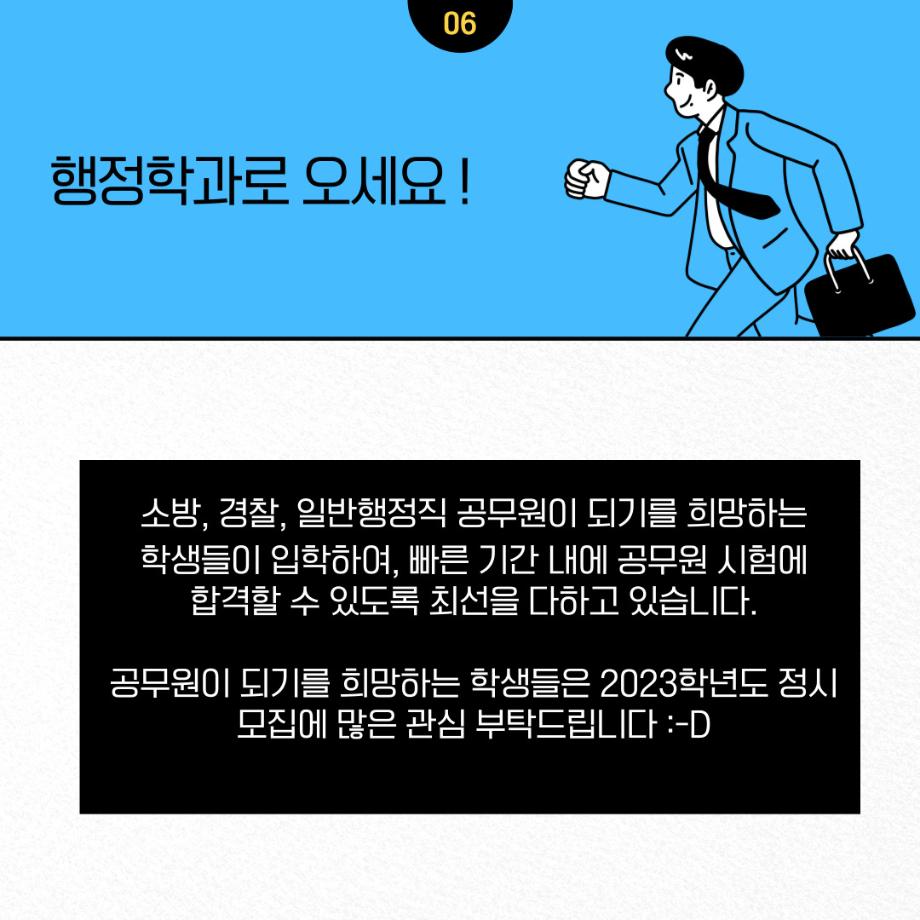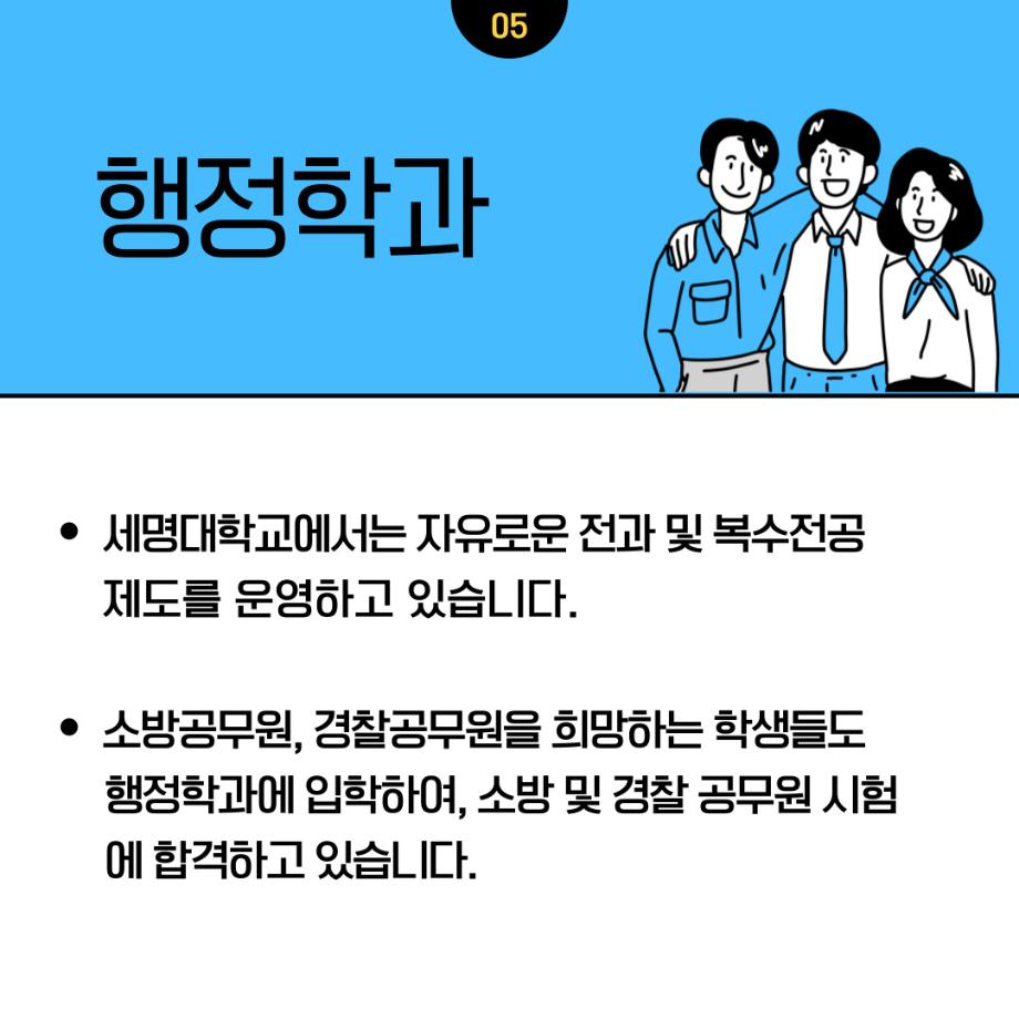 본문 시작 홈으로 학과소개 학과소개 교수소개 학과과정 커뮤니티 학과SNS 홈페이지가이드 입학안내 학과개요 학과장 인사말 학과연혁 교육목표 졸업 후 진로와 취업현황 학과행사 카드뉴스 입학안내 행정학 용어사전 입학안내 페이스북 트위터 프린트 📝2023학년도 행정학과 정시 모집📝 행정학과 2456 2022-12-30 안녕하세요! 2022년 12월 29일부터 2023년 1월 2일까지 세명대학교 행정학과 정시모집 원서접수 기간입니다. 공무원이 되기를 희망하는 학생들을 환영합니다🤗많은 관심과 지원 바랍니다~‼ 목록 이전[이벤트] 2023학년도 정시모집 지원학생(희망자)들을 위한 sns 이벤트! 만족도조사 만족도 조사 이 페이지에서 제공하는 정보에 대하여 만족하시나요? 매우만족 만족 보통 불만족 매우불만족