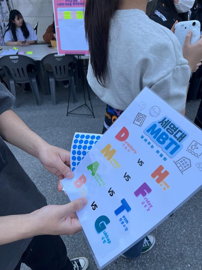 세명대학교 재미있는 경험을 위한 학생위원회 중 알려주는 위원회는 5월 17일(수) 학생회관 앞에서 ‘너의 MBTI를 알려줘!’라는 행사를 진행하였다.