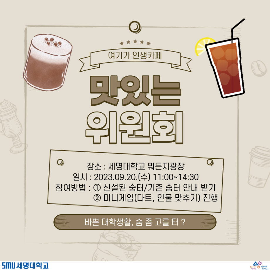 음료는 2023학년도 1학기에 가장 인기 있던 메뉴로 선정하였으며, 첨단정보관에 신설된 숨터(SUMTU)와 기존에 있던 숨터의 위치를 알려주는 내용으로 진행되었다.
