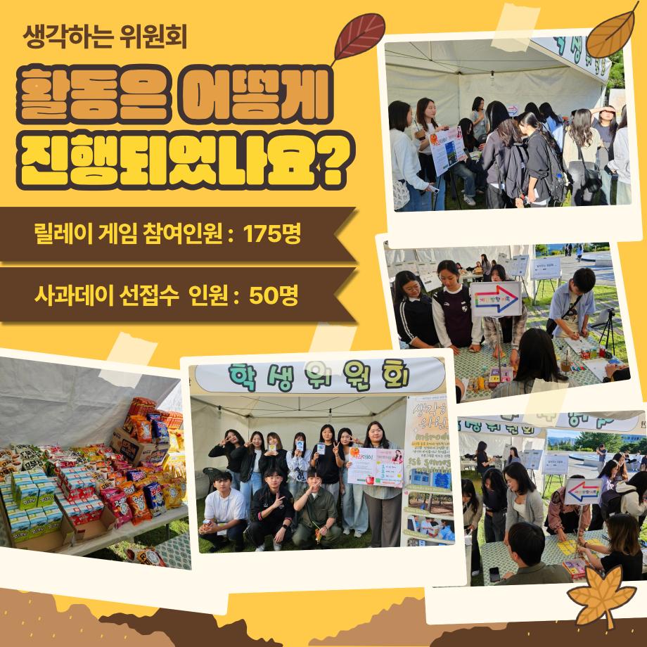 생각하는 위원회 행사에 많은 관심과 참여해 주신 구성원 여러분께 감사의 말씀드립니다! 접수해주신 사과데이 엽서는 10월 24일 사과데이까지 상시접수 일정이 지나고 25일부터 일주일간 찾아가실 수 있습니다. 2024년 남은 생각하는 위원회 행사도 함께해 주세요♡