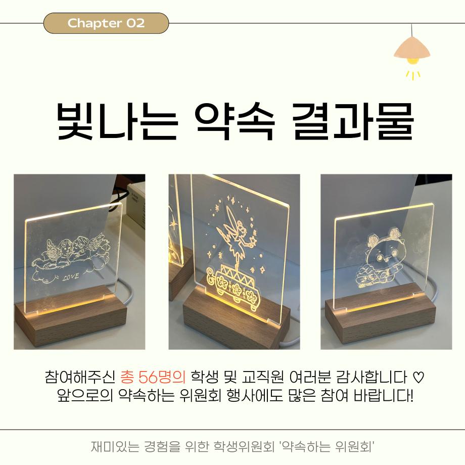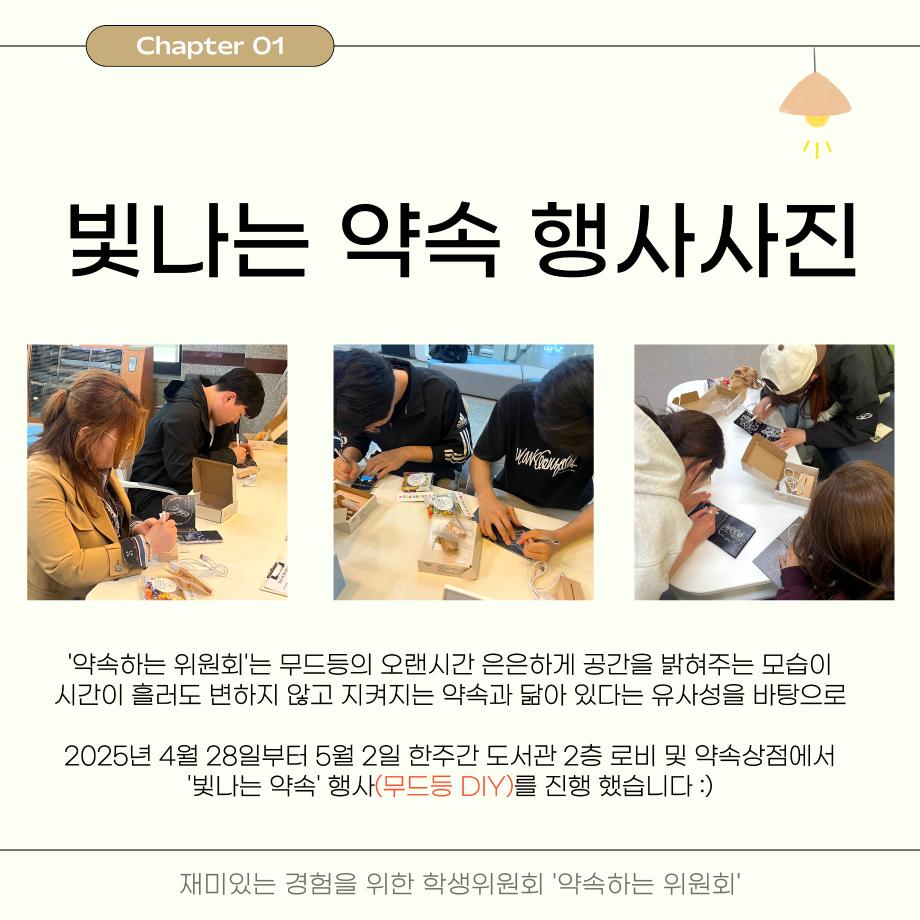 본문 시작 홈으로 포토갤러리 학생위원회 개요 학생위원회 소개 공지사항 활동결과 홈페이지가이드 포토갤러리 페이스북 트위터 프린트 [약속하는 위원회] 빛나는 약속 학술정보원 1033 2025-05-13 안녕하세요 재미있는 경험을 위한 학생위원회 '약속하는 위원회' 입니다! 약속하는 위원회 행사인 빛나는 약속 활동이 성황리에 마무리 되었습니다 :) [빛나는 약속 행사 결과] 일시 : 2025년 4월 28일(월) ~ 5월 2일(금) 장소 : 도서관 2층 로비 및 약속상점 행사 참여자 : 56명 빛나는 약속 행사에 참여해주신 모든 분들께 진심으로 감사드립니다! 추후에 이어질 약속하는 위원회 활동도 많은 관심 바랍니다! 목록 이전제 3기 학생위원회 최종보고회 다음 [생각하는 위원회]생각 다락방 담당부서 : 장학복지팀 담당자 : - 연락처 : 043-649-1142 최종수정일 : 2024-10-26 만족도조사 만족도 조사 이 페이지에서 제공하는 정보에 대하여 만족하시나요? 매우만족 만족 보통 불만족 매우불만족