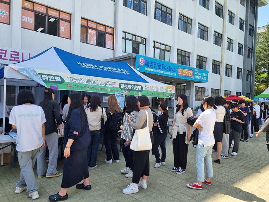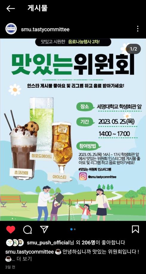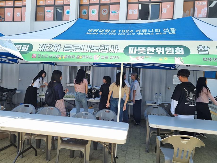 본문 시작 홈으로 포토갤러리 학생위원회 개요 학생위원회 소개 공지사항 활동결과 홈페이지가이드 포토갤러리 페이스북 트위터 프린트 [맛있는 위원회]제 2회 음료나눔행사 학생처 3343 2023-06-01 세명대학교 재미있는 경험을 위한 학생위원회 중 '맛있는 위원회'는 5월 25일(목) 14시부터 17시까지 학생회관 앞에서 음료나눔행사를 진행하였다. 음료 메뉴는 5월 18일 청룡체전기간 동안 진행한 설문조사 결과를 반영하여 선정하였고, 초코라떼, 청포도에이드, 아이스티, 커피 음료를 제공하였다. 추가로, '맛있는위원회'는 이날 음료나눔행사를 통해 공식 SNS를 공유하여 본교 구성원과의 소통을 위한 자리를 가졌다. 목록 이전[알려주는 위원회] 너의MBTI를 알려줘 다음 [따뜻한 위원회] 찰나의 따뜻함 담당부서 : 장학복지팀 담당자 : - 연락처 : 043-649-1142 최종수정일 : 2024-10-26 만족도조사 만족도 조사 이 페이지에서 제공하는 정보에 대하여 만족하시나요? 매우만족 만족 보통 불만족 매우불만족