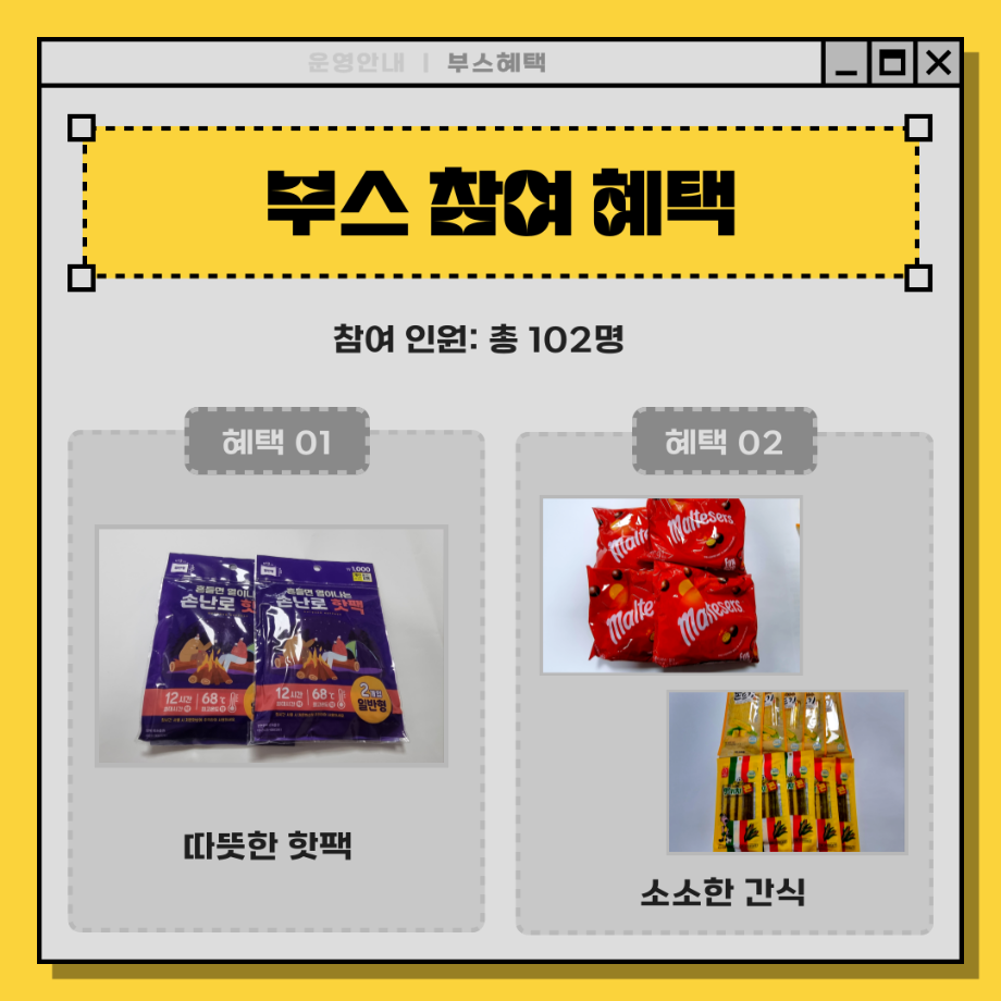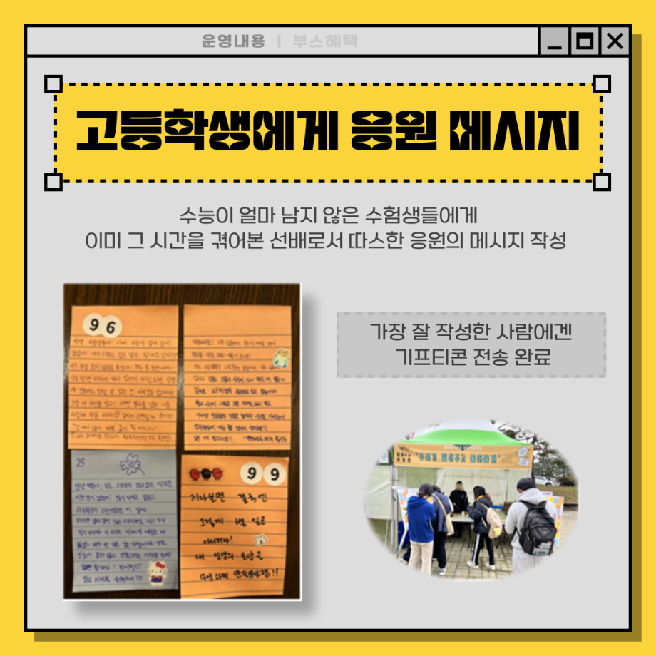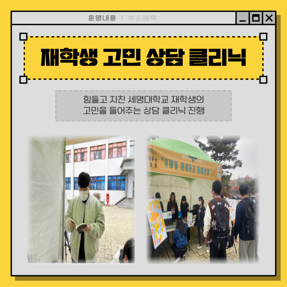 본문 시작 홈으로 포토갤러리 학생위원회 개요 학생위원회 소개 공지사항 활동결과 홈페이지가이드 포토갤러리 페이스북 트위터 프린트 [밀어주는 위원회] 2023년 2학기. 두 번째 행사 입학관리본부 3250 2023-11-09 1. 행사일정 : 2023.11.01.(수) 2. 행사장소 : 세명스퀘어(학생회관 앞 광장) 3. 행사내용 - 세명대학교 재학생들이 고3 수험생들에게 수능 응원 메시지 보내기 - 재학생 고민 상담 클리닉 4. 행사참여인원 : 102명 목록 이전[착한 위원회] 2023-2학기 포롱포롱 공방 운영 결과 다음 [착한위원회] 최종보고회 착한위원회SNS팔로우 이벤트 담당부서 : 장학복지팀 담당자 : - 연락처 : 043-649-1142 최종수정일 : 2024-10-26 만족도조사 만족도 조사 이 페이지에서 제공하는 정보에 대하여 만족하시나요? 매우만족 만족 보통 불만족 매우불만족