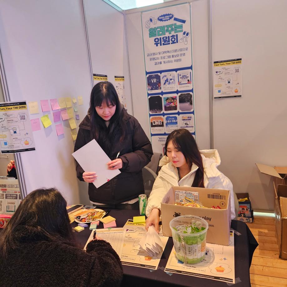 본문 시작 홈으로 포토갤러리 학생위원회 개요 학생위원회 소개 공지사항 활동결과 홈페이지가이드 포토갤러리 페이스북 트위터 프린트 [알려주는 위원회] 최종보고회 부스운영 대학혁신지원단 2941 2023-11-22 <알려주는 위원회 활동 결과 내용> [알려주는 위원회] 알려주는 위원회 Your Turn, Your TMI 역질문 이벤트 1. 행사일시: 2023년 11월 16일(목) 11:30~18:00 -제2회 학생위원회 최종보고회 기간 2. 행사장소: 학술관 1층 로비(알려주는 위원회 부스) 3. 행사내용 1) 알려주는 위원회 상담 및 가신청 2) 알려주는 위원회 팔로우 및 역질문 답글 달기 이벤트 3) 간식 나눔 4. 참여인원: 107명 목록 이전[통하는 위원회] 최종보고회 부스 이전[생각하는 위원회] 제 2회 멍때리기 대회 담당부서 : 장학복지팀 담당자 : - 연락처 : 043-649-1142 최종수정일 : 2024-10-26 만족도조사 만족도 조사 이 페이지에서 제공하는 정보에 대하여 만족하시나요? 매우만족 만족 보통 불만족 매우불만족