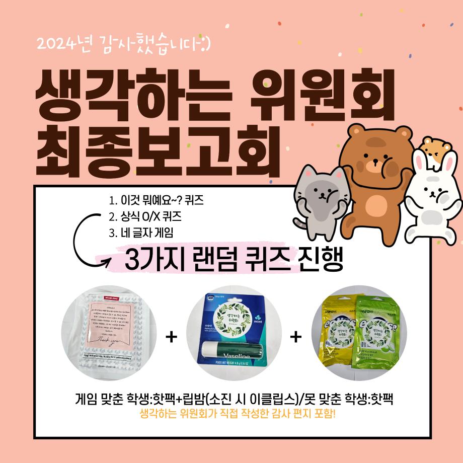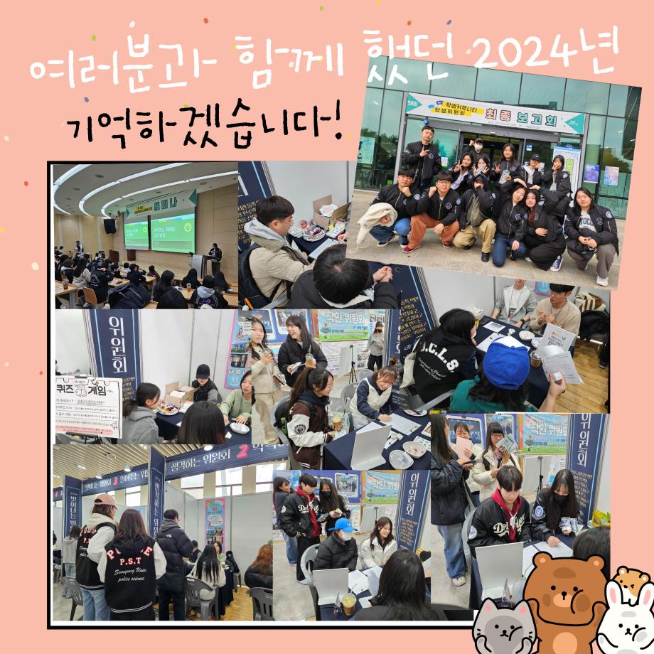 본문 시작 홈으로 포토갤러리 학생위원회 개요 학생위원회 소개 공지사항 활동결과 홈페이지가이드 포토갤러리 페이스북 트위터 프린트 [생각하는 위원회] 최종보고회 감사이벤트 학술정보원 1679 2024-11-25 일시 : 2024.11.21(목) 장소 : 학술관 1층 로비 활동내용 : 생각하는 위원회 상담 및 가신청, 게임 진행하여 상품 전달 참여인원 : 154명 올해 생각하는 위원회를 사랑해주신 학생 여러분께 감사의 말씀 전합니다. 작게나마 최종보고회 부스를 통해 감사함을 전달할 수 있는 좋은 시간이었습니다. 2025년 학생위원회 많은 관심 부탁드립니다:) 감사합니다! 목록 이전[용감한 위원회]도전! 인테리어 창업 체험부츠 운영 이전[생각하는 위원회] 사과데이 담당부서 : 장학복지팀 담당자 : - 연락처 : 043-649-1142 최종수정일 : 2024-10-26 만족도조사 만족도 조사 이 페이지에서 제공하는 정보에 대하여 만족하시나요? 매우만족 만족 보통 불만족 매우불만족