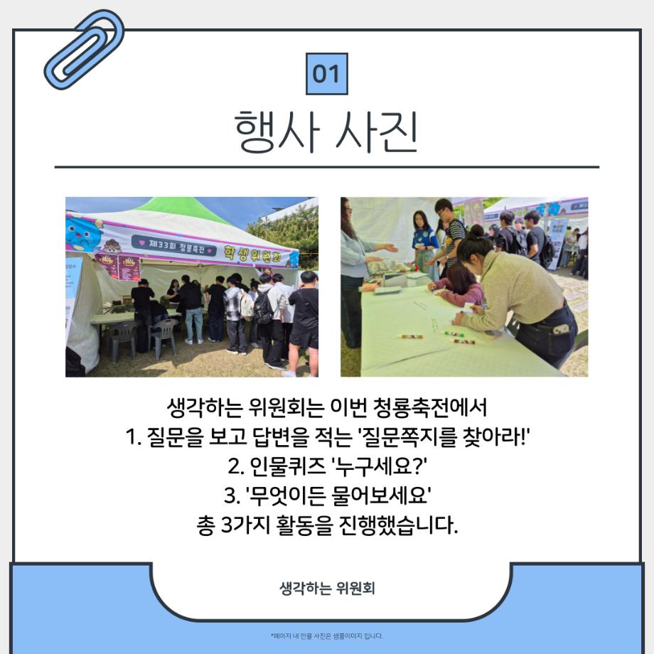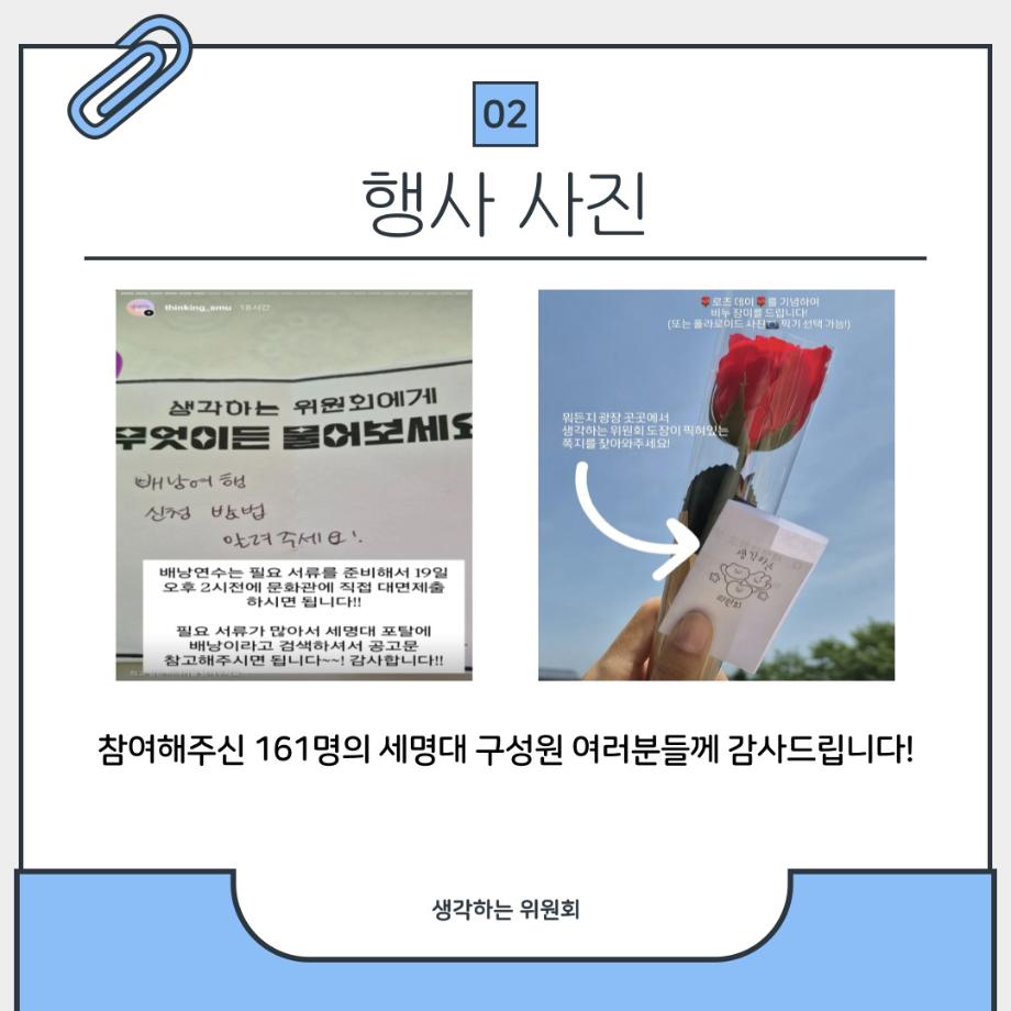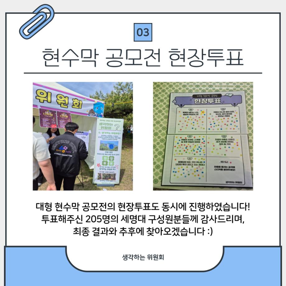 본문 시작 홈으로 포토갤러리 학생위원회 개요 학생위원회 소개 공지사항 활동결과 홈페이지가이드 포토갤러리 페이스북 트위터 프린트 [생각하는 위원회]생각 다락방 학술정보원 1269 2025-05-22 프로그램명 : 생각 다락방 일시 : 2025.05.14(수) 13:30~17:00 장소 : 뭐든지 광장 학생위원회 부스 활동내용 : 질문쪽지 찾기, 인물퀴즈, 무엇이든 물어보세요, 대형현수막 공모전 현장투표 참여인원 : 부스 행사 161명 참여, 대형현수막 공모전 현장투표 205명 참여 대형현수막 공모전 현장투표는 추후에 최종 결과를 만나보실 수 있습니다🤍 앞으로도 생각하는 위원회와 함께 해요! 목록 이전[약속하는 위원회] 빛나는 약속 이전[꽃피는 위원회] 제4회 벚꽃축제 '벚꽃세봄' 담당부서 : 장학복지팀 담당자 : - 연락처 : 043-649-1142 최종수정일 : 2024-10-26 만족도조사 만족도 조사 이 페이지에서 제공하는 정보에 대하여 만족하시나요? 매우만족 만족 보통 불만족 매우불만족