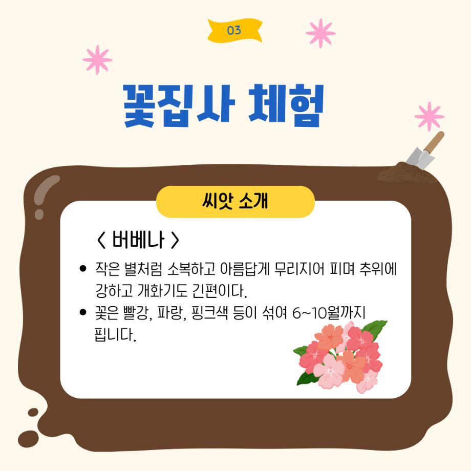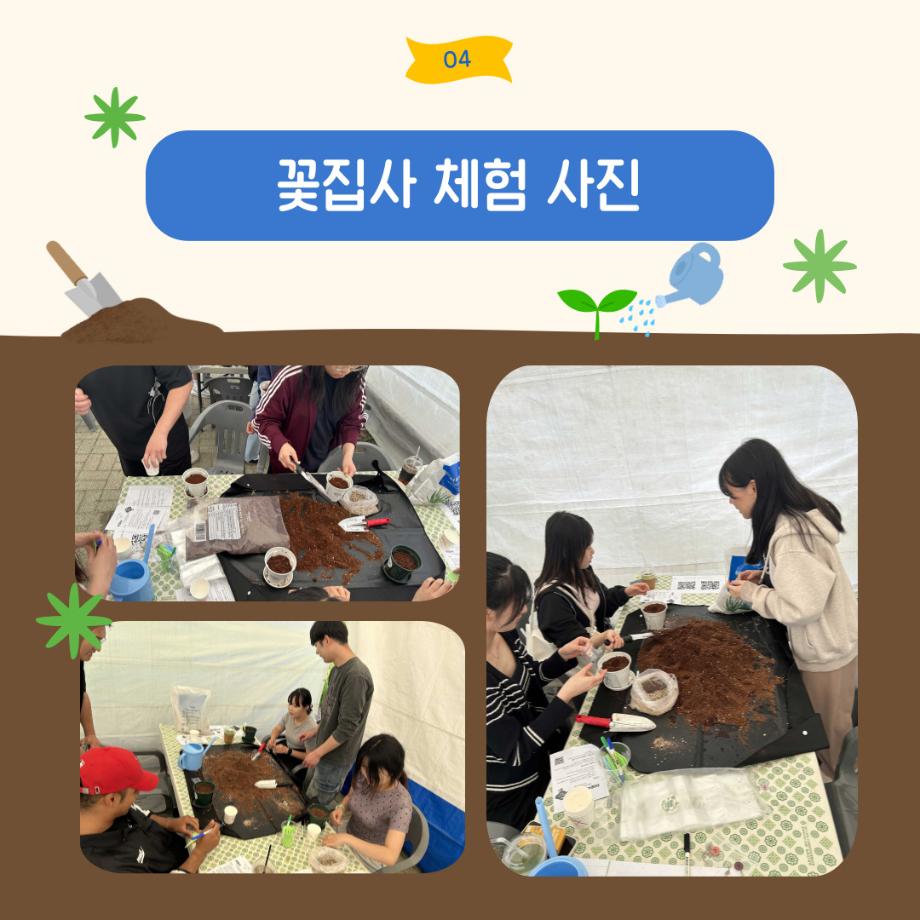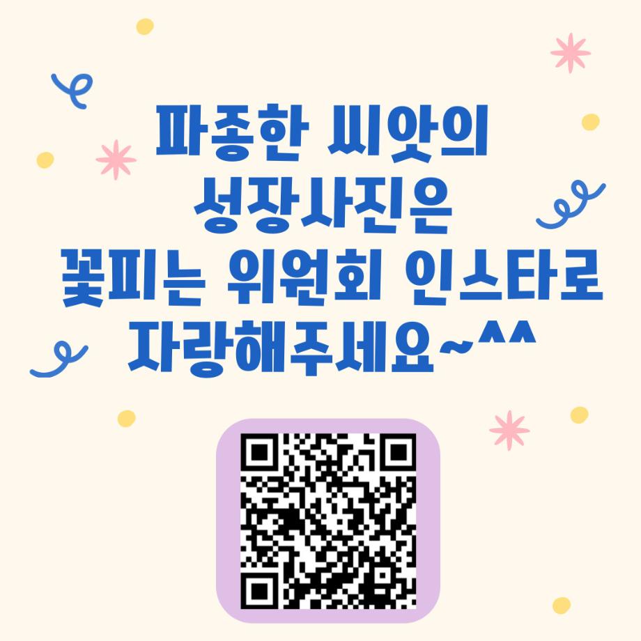 본문 시작 홈으로 포토갤러리 학생위원회 개요 학생위원회 소개 공지사항 활동결과 홈페이지가이드 포토갤러리 페이스북 트위터 프린트 [꽃피는 위원회] 제 4회 사랑의 꽃집사 체험이벤트 학생처 1264 2025-05-28 [꽃피는 위원회] 제 4회 사랑의 꽃집사 체험이벤트 1. 일시: 5월 22일 12시~15시 2. 장소: 학생회관 앞 광장 3. 참여인원: 본교 구성원 114명 참여 4. 행사내용: 랜덤돌리기를 통한 씨앗 선정 후 씨앗 파종 진행, 참여완료자에 한해 만족도 조사 실시 5. 행사 만족도 조사 : 4.9/5.0 목록 이전[약속하는 위원회] 달려라 에코레이서 다음 [생각하는 위원회] 대형 현수막 문구 공모전 'Hear, 위로' 담당부서 : 장학복지팀 담당자 : - 연락처 : 043-649-1142 최종수정일 : 2024-10-26 만족도조사 만족도 조사 이 페이지에서 제공하는 정보에 대하여 만족하시나요? 매우만족 만족 보통 불만족 매우불만족
