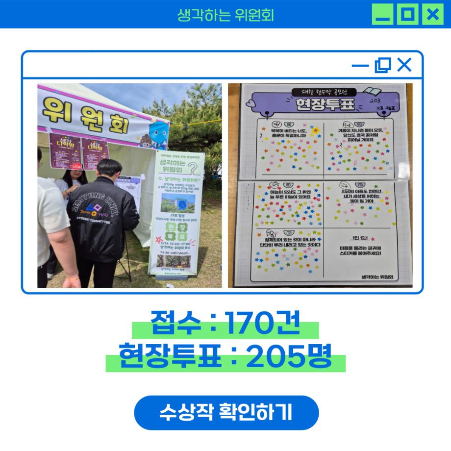 현장투표는 205명이 참여하였으며, 2차 심사와 현장투표 결과를 합산하여 최종 수상자를 결정하게 되었습니다. 1등 문구로 6월 11일(수) 학술정보원(도서관) 동쪽 측벽에 대형 현수막이 설치되었습니다.