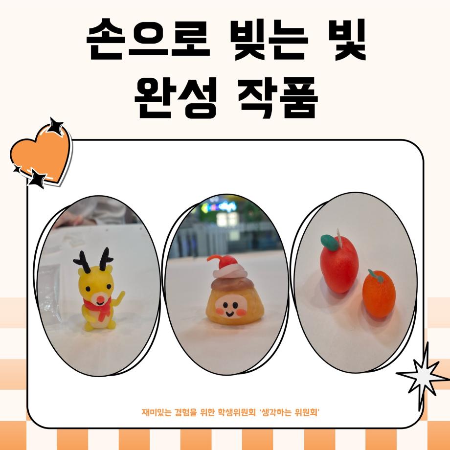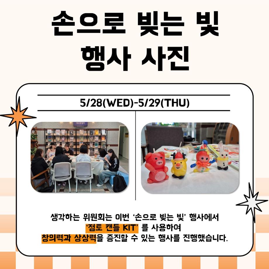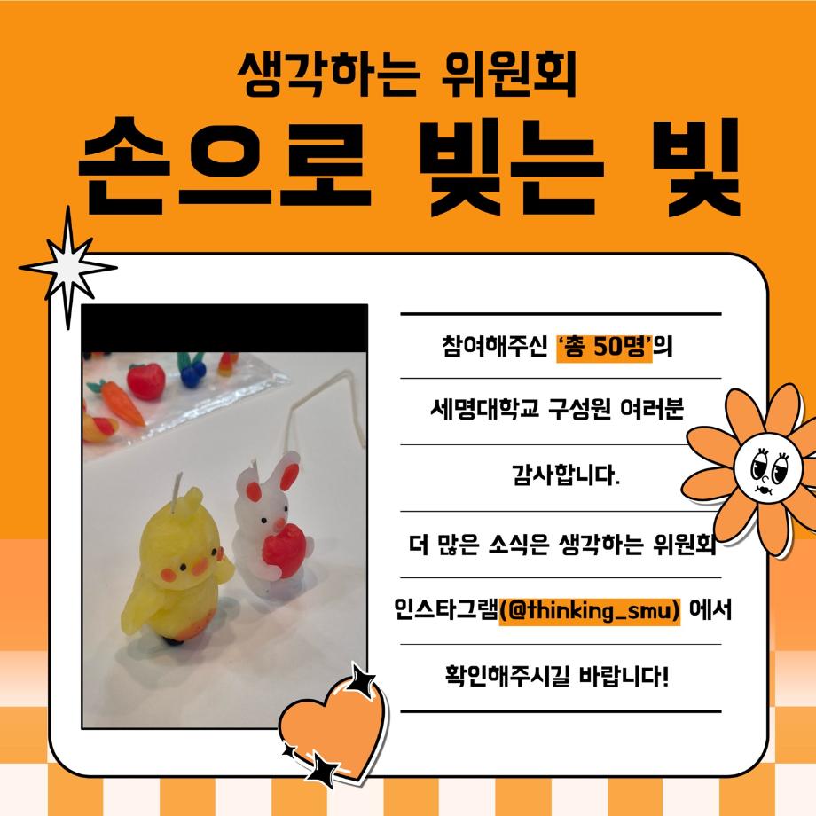 본문 시작 홈으로 포토갤러리 학생위원회 개요 학생위원회 소개 공지사항 활동결과 홈페이지가이드 포토갤러리 페이스북 트위터 프린트 [생각하는 위원회] 손으로 빚는 빛 학술정보원 1185 2025-05-30 프로그램명 : 손으로 빚는 빛 일시 : 2025년 5월 28일(수)~29일(목) 13:30~16:00 장소 : 도서관 2층 로비 활동내용 : 점토양초 DIY로 나만의 양초 만들기 행사 참여자 : 50명 안녕하세요! 재미있는 경험을 위한 학생위원회 '생각하는 위원회'입니다 :) 손으로 빚는 빛 행사에 참여해주신 모든 분들께 감사드립니다! 앞으로도 생각하는 위원회의 활동들에 많은 관심 부탁드립니다🤍 목록 다음 [생각하는 위원회] 대형 현수막 문구 공모전 'Hear, 위로' 다음 [약속하는 위원회] 뽕뽕오락실 담당부서 : 장학복지팀 담당자 : - 연락처 : 043-649-1142 최종수정일 : 2024-10-26 만족도조사 만족도 조사 이 페이지에서 제공하는 정보에 대하여 만족하시나요? 매우만족 만족 보통 불만족 매우불만족