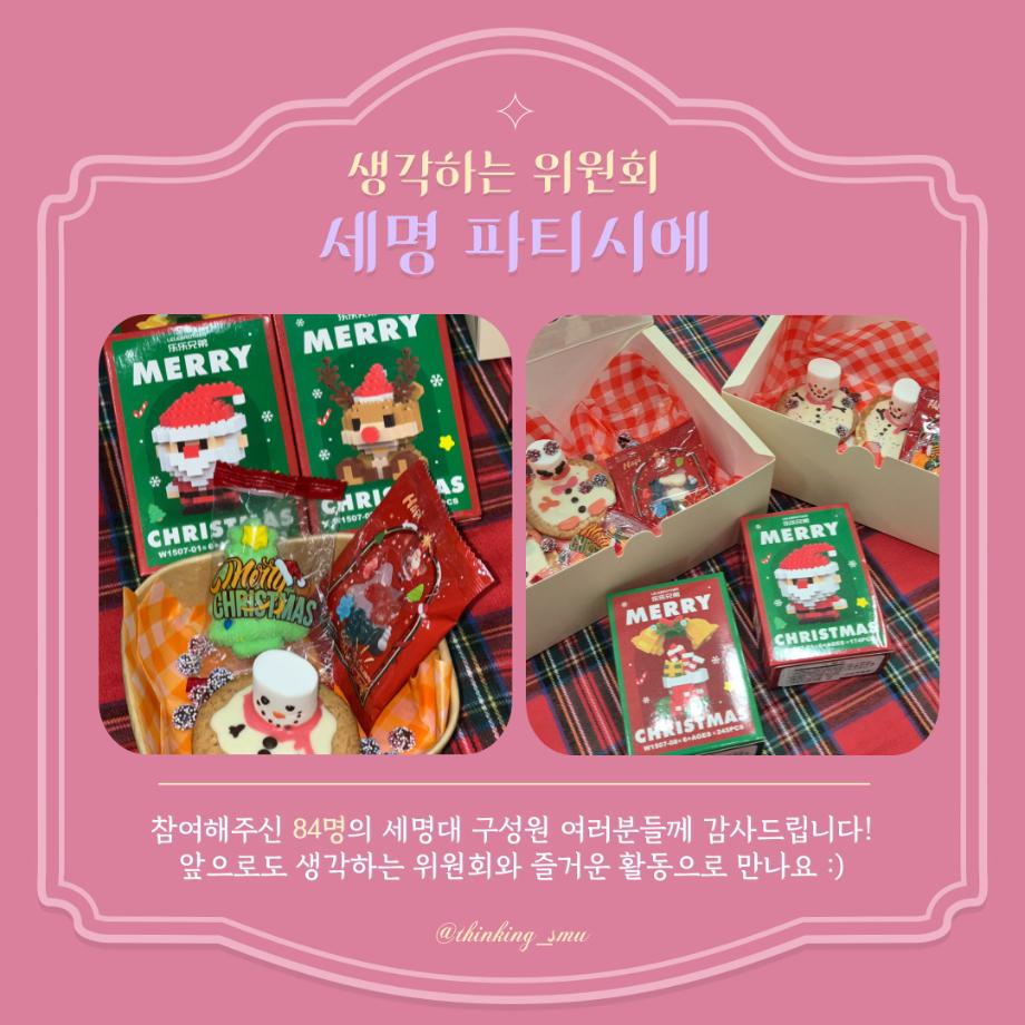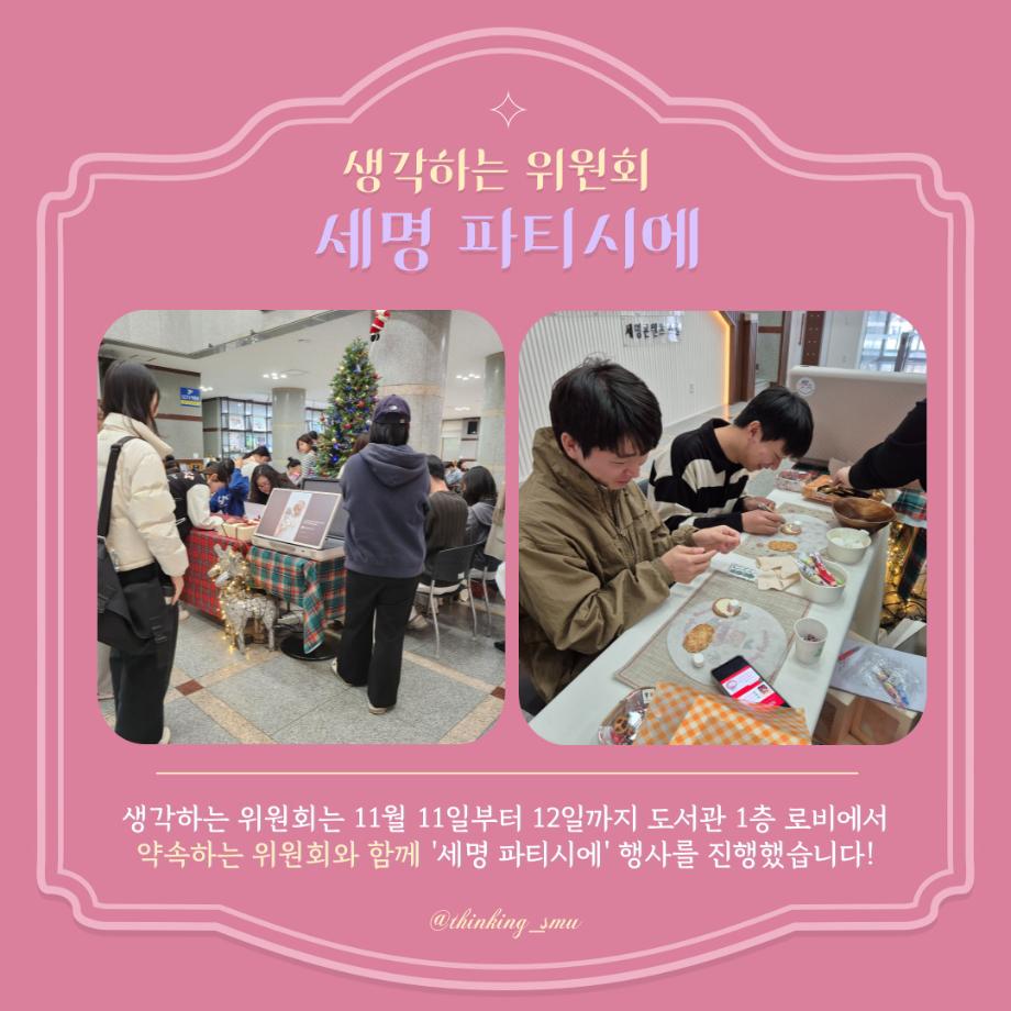 본문 시작 홈으로 포토갤러리 학생위원회 개요 학생위원회 소개 공지사항 활동결과 홈페이지가이드 포토갤러리 페이스북 트위터 프린트 [생각하는 위원회] 학술지원팀 963 2025-11-19 안녕하세요! 재미있는 경험을 위한 학생위원회 '생각하는 위원회'입니다! 생각하는 위원회 행사인 세명 파티시에 활동이 마무리되었습니다👏 [세명 파티시에 행사 결과] 일시 : 2025년 11월 11일(화)~11월 12일(수) 장소 : 도서관 1층 로비 참여자 : 84명 2025년에도 생각하는 위원회의 활동에 많은 관심을 주셔서 감사합니다! 내년에도 재미있는 활동으로 만나요❤️ 목록 이전[약속하는,생각하는 위원회] 세명파티시에 이전[꽃피는 위원회] 북!마크! 해버렸지뭐야 담당부서 : 장학복지팀 담당자 : - 연락처 : 043-649-1142 최종수정일 : 2024-10-26 만족도조사 만족도 조사 이 페이지에서 제공하는 정보에 대하여 만족하시나요? 매우만족 만족 보통 불만족 매우불만족