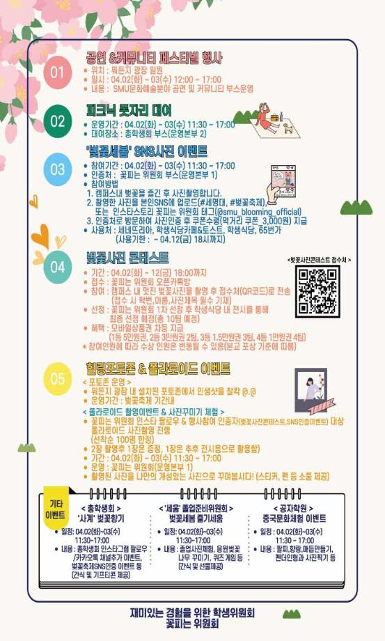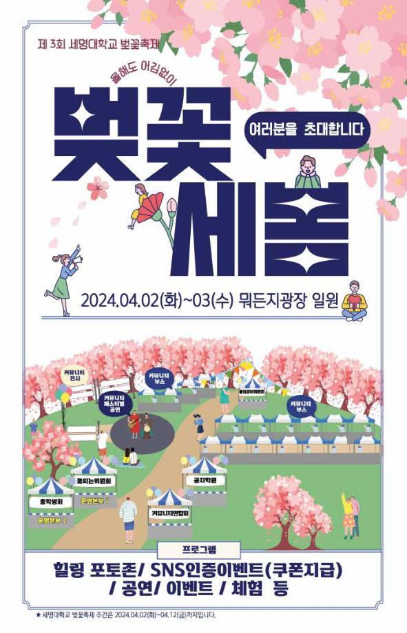 본문 시작 홈으로 공지사항 학생위원회 개요 학생위원회 소개 공지사항 활동결과 홈페이지가이드 프로그램 계획 프로그램 계획 세명대학교 공지사항 프로그램 계획 페이스북 트위터 프린트 [꽃피는 위원회]제 3회 벚꽃축제 진행 학생처 1712 2024-04-02 2024년 세명대학교 제 3회 벚꽃축제를 진행합니다. 벚꽃사진콘테스트, sns사진업로드 이벤트, 폴라로이드이벤트 등 여러가지 프로그램을 실시하오니 많은 참여부탁드립니다. 목록 이전[생각하는 위원회] 제 3차 생각게시판 운영 다음 [약속하는 위원회] 2024년도 약속상점 운영안내 담당부서 : 장학복지팀 담당자 : - 연락처 : 043-649-1142 최종수정일 : 2024-10-26 만족도조사 만족도 조사 이 페이지에서 제공하는 정보에 대하여 만족하시나요? 매우만족 만족 보통 불만족 매우불만족