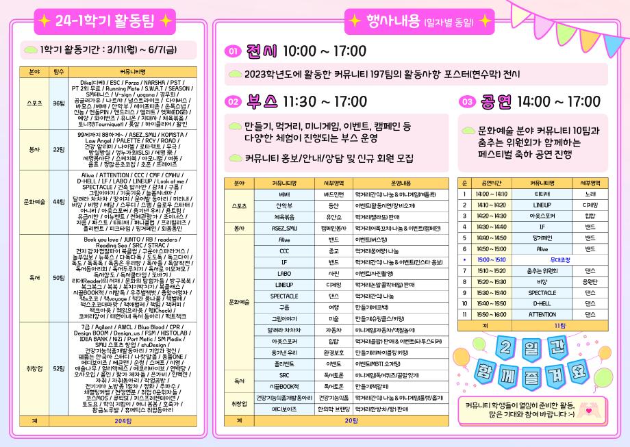 본문 시작 홈으로 공지사항 학생위원회 개요 학생위원회 소개 공지사항 활동결과 홈페이지가이드 프로그램 계획 프로그램 계획 세명대학교 공지사항 프로그램 계획 페이스북 트위터 프린트 [춤추는 위원회] 커뮤니티 페스티벌 축하공연 학생처 1735 2024-04-02 춤추는 위원회에서 제 9회 커뮤니티 페스티벌 축하공연에 참여합니다. 많은 관람 부탁드립니다. 목록 다음 [약속하는 위원회] 2024년도 약속상점 운영안내 다음 [꽃피는 위원회] 벚꽃사진콘테스트 담당부서 : 장학복지팀 담당자 : - 연락처 : 043-649-1142 최종수정일 : 2024-10-26 만족도조사 만족도 조사 이 페이지에서 제공하는 정보에 대하여 만족하시나요? 매우만족 만족 보통 불만족 매우불만족