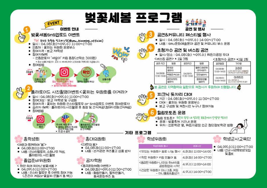 본문 시작 홈으로 공지사항 학생위원회 개요 학생위원회 소개 공지사항 활동결과 홈페이지가이드 프로그램 계획 프로그램 계획 세명대학교 공지사항 프로그램 계획 페이스북 트위터 프린트 [꽃피는 위원회]제4회 세명대학교 벚꽃축제 '벚꽃세봄' 학생처 1055 2025-03-31 [꽃피는 위원회]제4회 세명대학교 벚꽃축제 '벚꽃세봄' 일시 : 2025.04.08(화)~09(수) 11:00~17:00 장소 : 뭐든지광장 일원 내용 : 공연, 이벤트, 체험, 포토존 운영 등 다양한 행사 진행 목록 이전2025학년도 재미있는 경험을 위한 학생위원회 모집 안내 다음 [용감한 위원회]나만의 하바리움, 공방 창업의 시작! 담당부서 : 장학복지팀 담당자 : - 연락처 : 043-649-1142 최종수정일 : 2024-10-26 만족도조사 만족도 조사 이 페이지에서 제공하는 정보에 대하여 만족하시나요? 매우만족 만족 보통 불만족 매우불만족