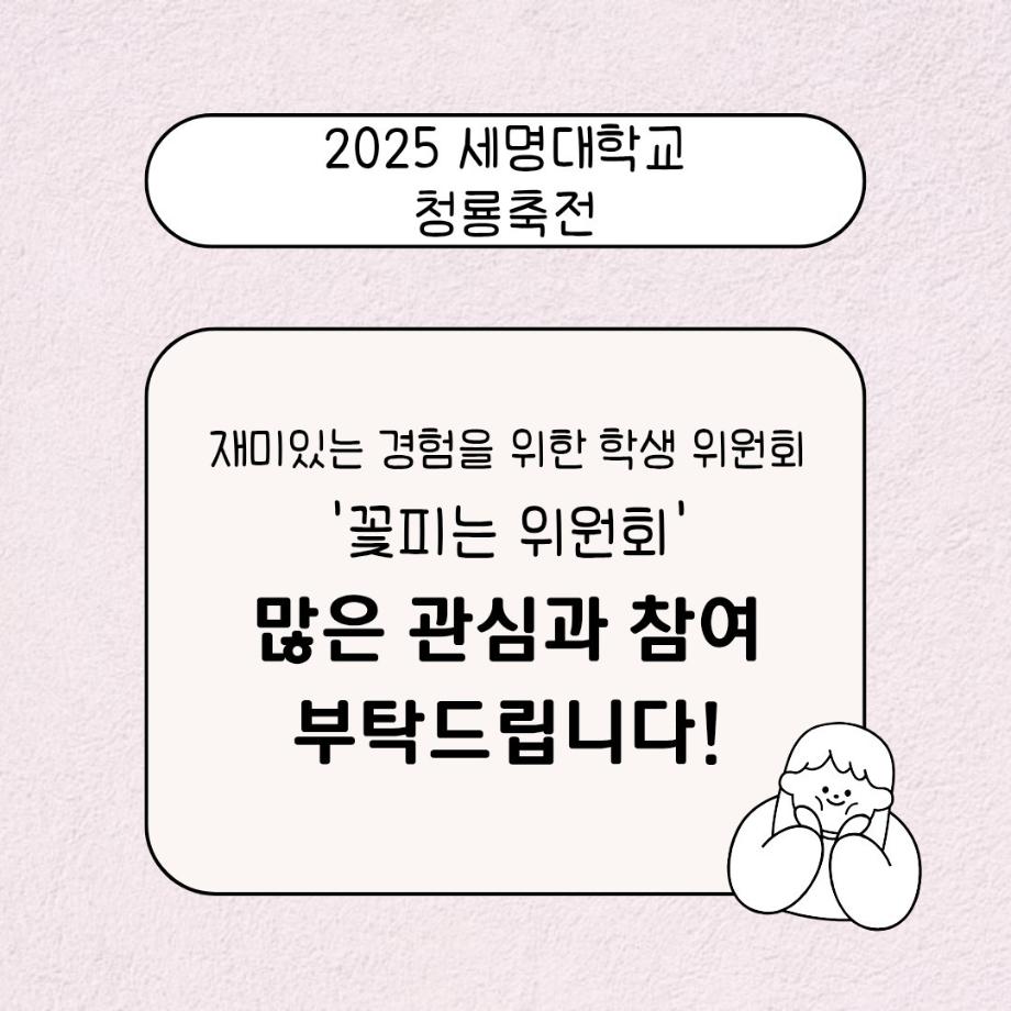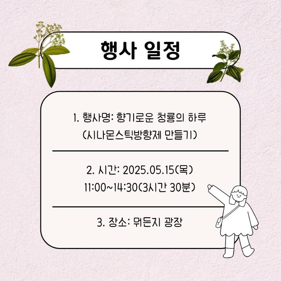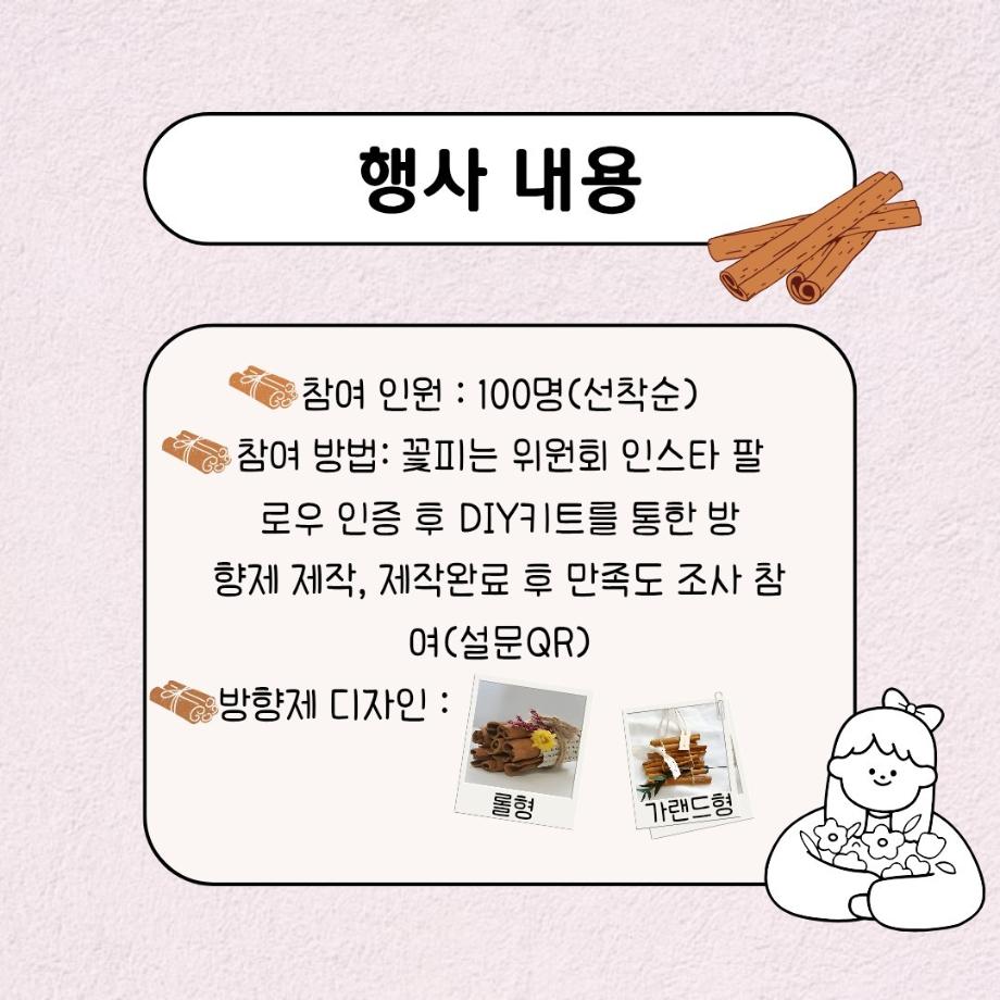 본문 시작 홈으로 공지사항 학생위원회 개요 학생위원회 소개 공지사항 활동결과 홈페이지가이드 프로그램 계획 프로그램 계획 세명대학교 공지사항 프로그램 계획 페이스북 트위터 프린트 [꽃피는 위원회] 향기로운 청룡의 하루(시나몬스틱 방향제 만들기) 학생처 674 2025-05-15 [향기로운 청룡의 하루(시나몬스틱 방향제 만들기) 1)일시: 2025.05.15(목) 11:00~14:30 2)장소: 뭐든지 광장 학생위원회 부스 3)대상: 본교 구성원 100명 한정 4)내용 : 꽃피는 위원회 인스타 팔로우 인증 -> 참여키트 수령 후 참여 -> 참여완료자 설문조사 참여(참여사진 업로드) -> 완료 많은 참여부탁드립니다. 목록 이전[용감한 위원회] 세명상점 다음 [착한 위원회] 향기를 담다 나를 담다 담당부서 : 장학복지팀 담당자 : - 연락처 : 043-649-1142 최종수정일 : 2024-10-26 만족도조사 만족도 조사 이 페이지에서 제공하는 정보에 대하여 만족하시나요? 매우만족 만족 보통 불만족 매우불만족