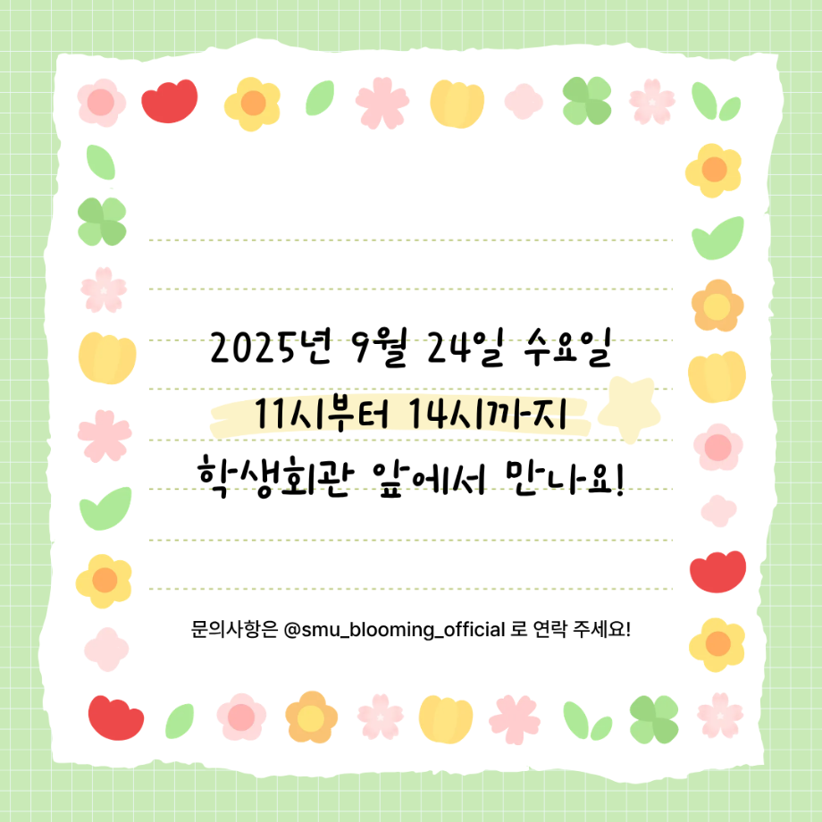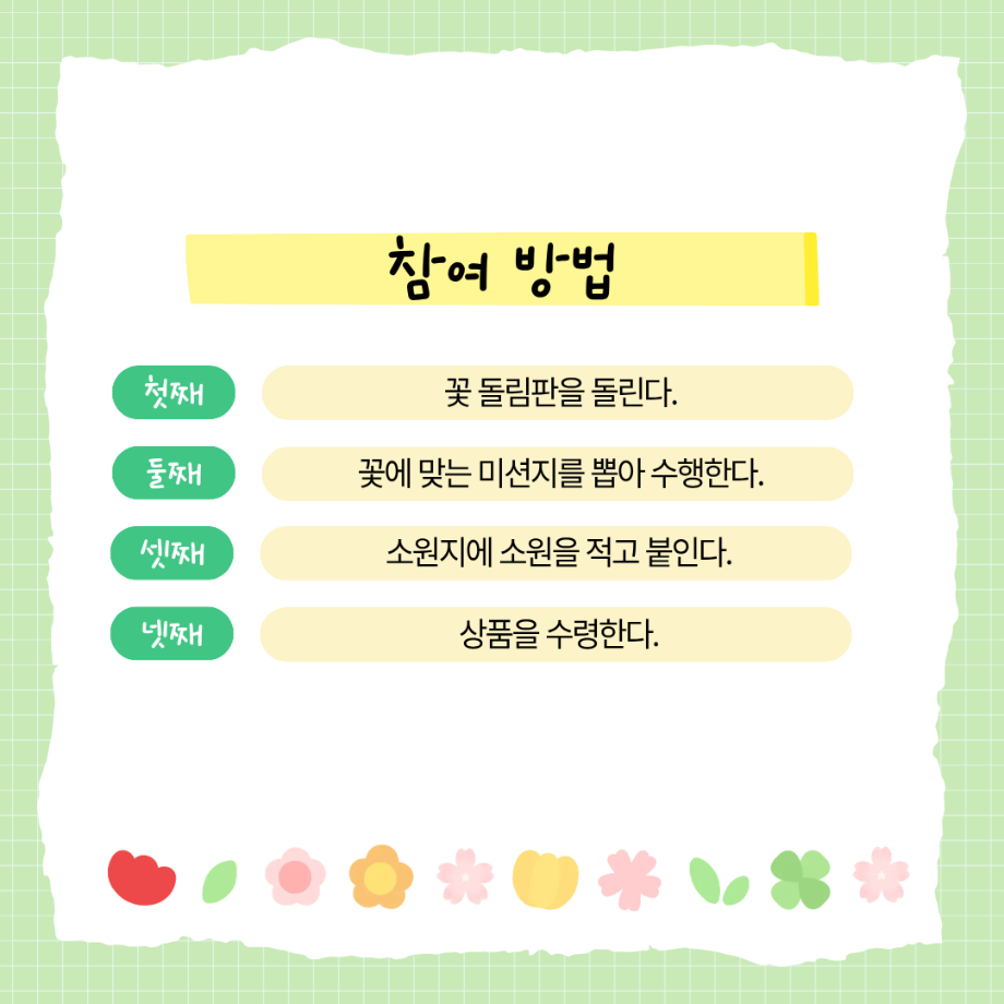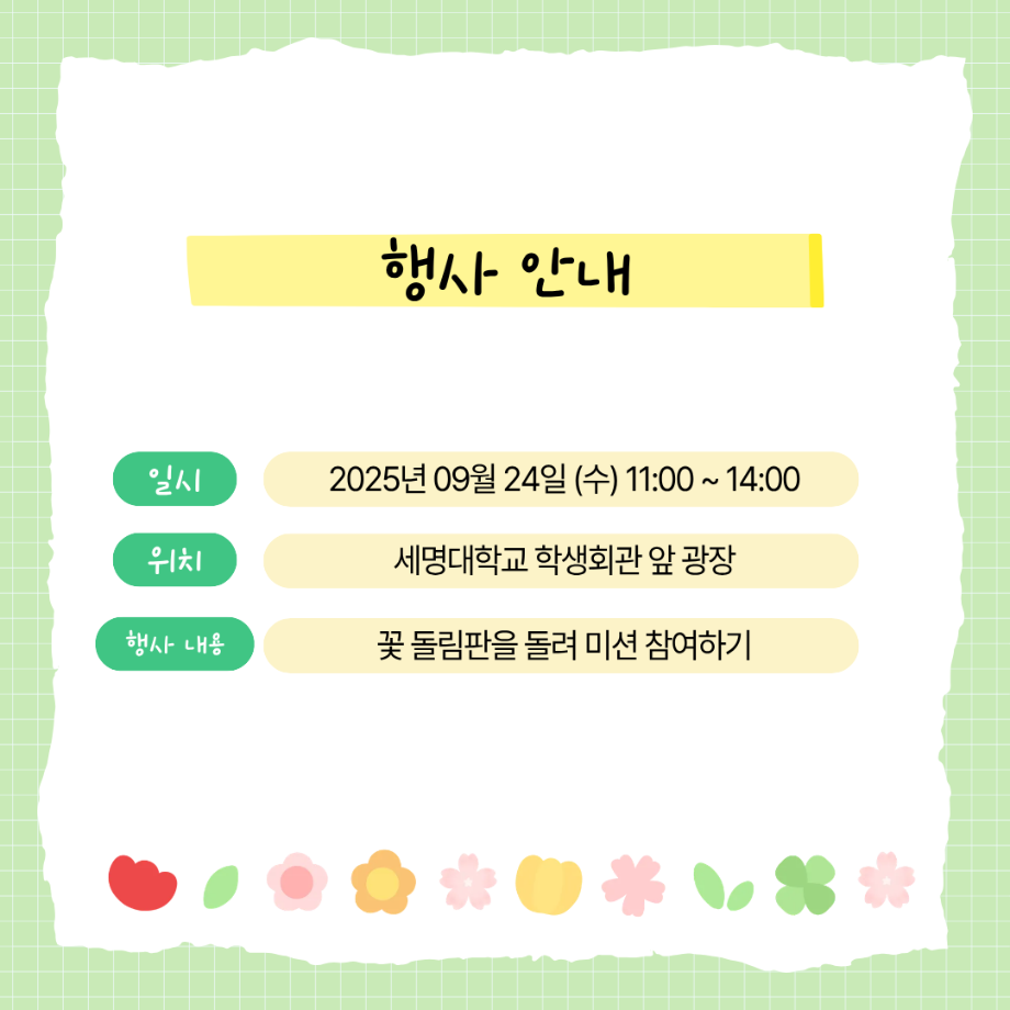 본문 시작 홈으로 공지사항 학생위원회 개요 학생위원회 소개 공지사항 활동결과 홈페이지가이드 프로그램 계획 프로그램 계획 세명대학교 공지사항 프로그램 계획 페이스북 트위터 프린트 [꽃피는 위원회] 꽃 돌려라 피어라! 학생처 269 2025-09-24 < 꽃피는 위원회 청룡체전기간 행사 안내 > 1. 행사명: 꽃 돌려라 피어라 2. 일시: 2025.9..24(수) 11:00~14:00 3. 장소: 학생회관 앞 광장 학생위원회 부스 4. 참여방법 - 꽃 돌림판을 돌린다 - 나온 꽃에 맞는 미션지를 뽑아 수행한다 - 소원지에 소원을 붙인다 - 상품을 수령한다 5. 상품: 이온음료 등 소소한 미션도 즐기고 소원도 남기며 즐거운 시간을 보내세요 학우 여러분의 많은 관심과 참여 부탁드립니다. 목록 이전[학생위원회] 청룡체전기간 학생위원회 전체활동안내 다음 [용감한 창업자] 어떤 향이 좋아? 담당부서 : 장학복지팀 담당자 : - 연락처 : 043-649-1142 최종수정일 : 2024-10-26 만족도조사 만족도 조사 이 페이지에서 제공하는 정보에 대하여 만족하시나요? 매우만족 만족 보통 불만족 매우불만족