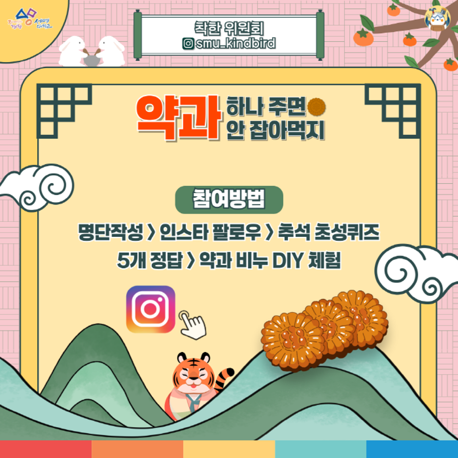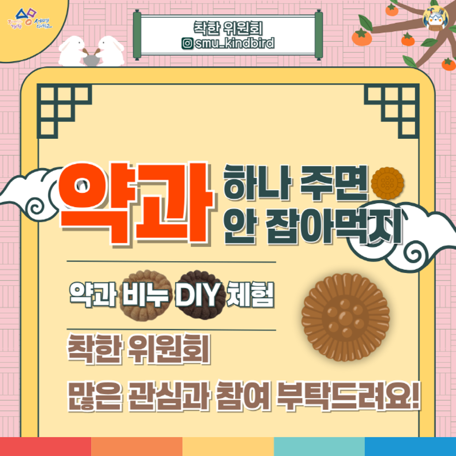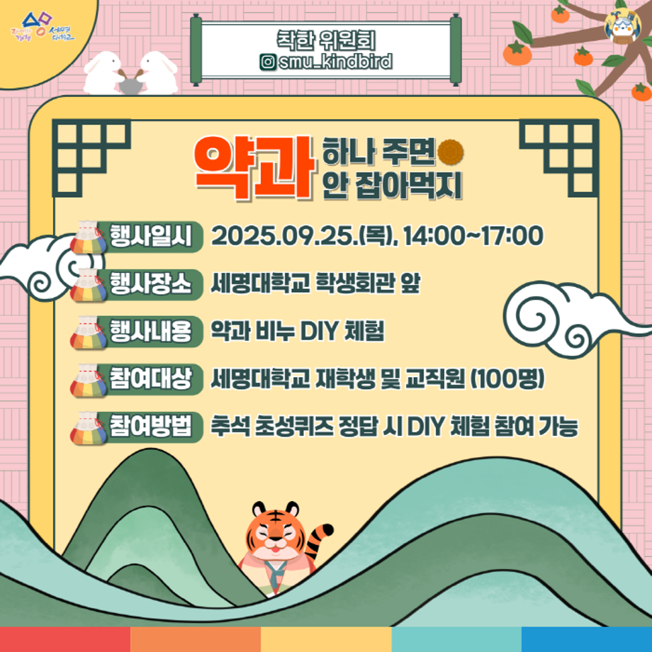 본문 시작 홈으로 공지사항 학생위원회 개요 학생위원회 소개 공지사항 활동결과 홈페이지가이드 프로그램 계획 프로그램 계획 세명대학교 공지사항 프로그램 계획 페이스북 트위터 프린트 [착한 위원회] 약과하나 주면 안잡아 먹지 학생처 275 2025-09-24 [착한 위원회] 약과 하나 주면 안 잡아먹지 1. 행사일시 ■ 2025년 9월 25일(목), 14시~17시 2. 행사장소 ■ 본교 학생회관 앞 3. 행사내용 ■ 추석 추성퀴즈 및 약과 비누 DIY 체험 4. 참여대상 ■ 본교 재학생 및 교직원 100명(선착순) 목록 이전[건강한 위원회] back tk spot 제자리로 다음 [꽃피는 위원회] 북!마크!해버렸지뭐야 담당부서 : 장학복지팀 담당자 : - 연락처 : 043-649-1142 최종수정일 : 2024-10-26 만족도조사 만족도 조사 이 페이지에서 제공하는 정보에 대하여 만족하시나요? 매우만족 만족 보통 불만족 매우불만족