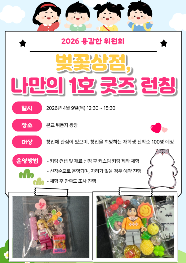 본문 시작 홈으로 공지사항 학생위원회 개요 학생위원회 소개 공지사항 활동결과 홈페이지가이드 프로그램 계획 프로그램 계획 세명대학교 공지사항 프로그램 계획 페이스북 트위터 프린트 [용감한 위원회] 벚꽃상점, 나만의 1호 굿즈 런칭 취창업지원처 41 2026-04-09 [용감한 위원회] 벚꽃상점, 나만의 1호 굿즈 런칭 1. 운영일자: 2026. 4. 9.(목) 12:30 ~ 15:30 2. 운영장소: 뭐든지 광장 3. 운영대상: 창업에 관심이 있으며 창업을 희망하는 재학생 및 교직원 등(선착순 100명!!) 4. 운영방법: 키링 컨셉 및 개료 재료 선정 후 키링 제작 체험 용감한 위원회에서 체험부스를 운영합니다! 본교 재학생 및 교직원께서는 많은 관심과 참여 부탁드립니다!! 💗💗 목록 이전제 4회 학생위원회 최종보고회 시행 이전[꽃피는 위원회] 제 5회 세명대학교 벚꽃축제 벚꽃세봄 담당부서 : 장학복지팀 담당자 : - 연락처 : 043-649-1142 최종수정일 : 2024-10-26 만족도조사 만족도 조사 이 페이지에서 제공하는 정보에 대하여 만족하시나요? 매우만족 만족 보통 불만족 매우불만족
