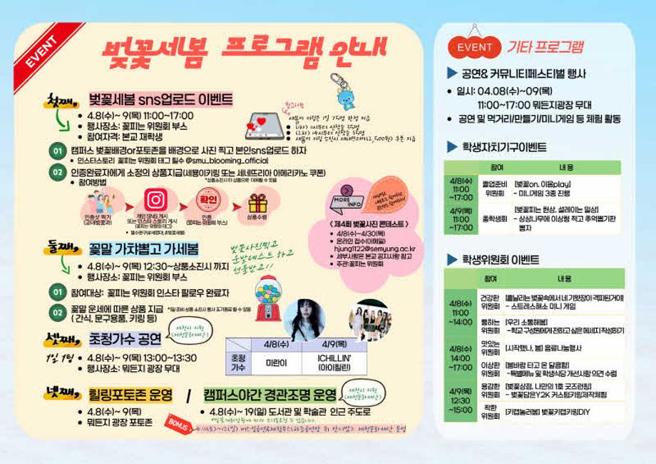 본문 시작 홈으로 공지사항 학생위원회 개요 학생위원회 소개 공지사항 활동결과 홈페이지가이드 프로그램 계획 프로그램 계획 세명대학교 공지사항 프로그램 계획 페이스북 트위터 프린트 [꽃피는 위원회] 제 5회 세명대학교 벚꽃축제 벚꽃세봄 학생처 51 2026-04-08 세명대학교 제 5회 벚꽃축제 [벚꽃세봄] 1. 일시:2026.04.08(수)~09(목) 2. 장소:뭐든지광장 일원 3. 내용: 포토존, 공연, 이벤트, 처험 등 각종 프로그램 진행 * 제 11회 커뮤니티 페스티벌과 함께 진행 목록 다음 [용감한 위원회] 벚꽃상점, 나만의 1호 굿즈 런칭 이전[생각하는 위원회] 현수막 공모전: 너도 도전해봐! 무한도전!🫧 담당부서 : 장학복지팀 담당자 : - 연락처 : 043-649-1142 최종수정일 : 2024-10-26 만족도조사 만족도 조사 이 페이지에서 제공하는 정보에 대하여 만족하시나요? 매우만족 만족 보통 불만족 매우불만족