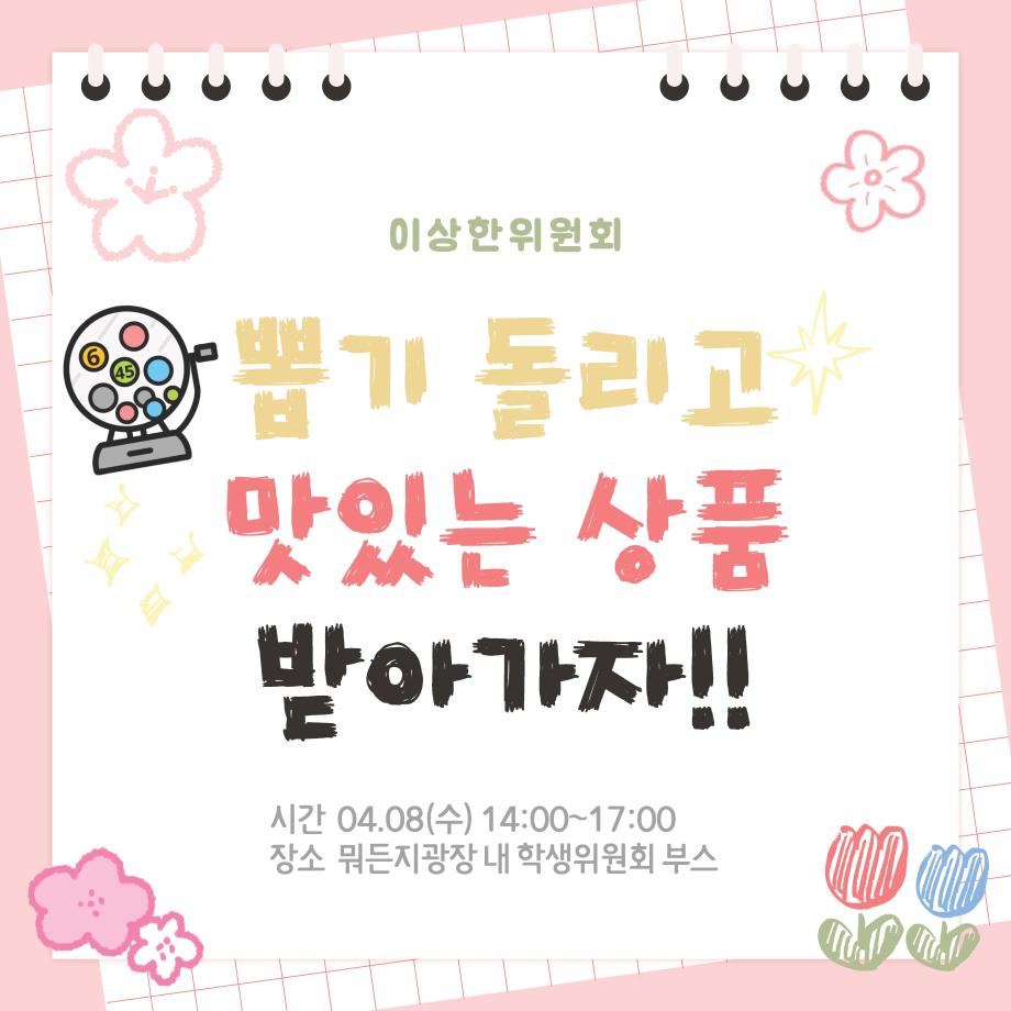 본문 시작 홈으로 공지사항 학생위원회 개요 학생위원회 소개 공지사항 활동결과 홈페이지가이드 프로그램 계획 프로그램 계획 세명대학교 공지사항 프로그램 계획 페이스북 트위터 프린트 [이상한 위원회] 봄바람 타고 온 달콤함 학생처 39 2026-04-08 <특별메뉴 추천 및 학생식당 개선의견 수렴행사> 1. 일시: 2026.04.08(스) 14:00`17:00 2. 장소: 뭐든지 광장 학생위원회 부스 3. 참여방법: 이상한 위원회 인스타 팔로우 하고 의견제시(포스트잇 부착 및 설문조사) 후 간식받자 목록 이전[이상한 위원회] 벚꽃 포토존 운영 담당부서 : 장학복지팀 담당자 : - 연락처 : 043-649-1142 최종수정일 : 2024-10-26 만족도조사 만족도 조사 이 페이지에서 제공하는 정보에 대하여 만족하시나요? 매우만족 만족 보통 불만족 매우불만족