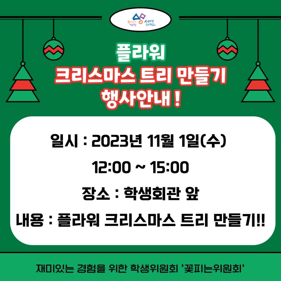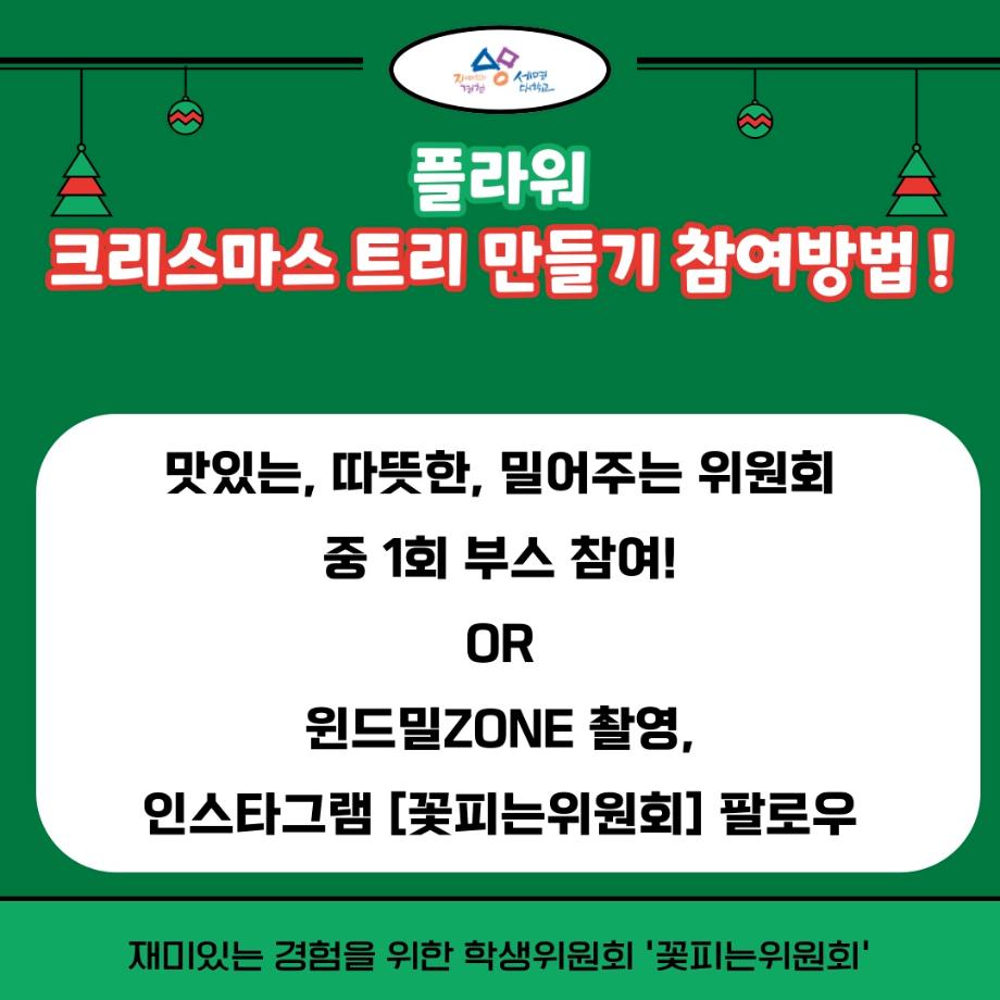 본문 시작 홈으로 공지사항 학생위원회 개요 학생위원회 소개 공지사항 활동결과 홈페이지가이드 프로그램 계획 프로그램 계획 세명대학교 공지사항 프로그램 계획 페이스북 트위터 프린트 [꽃피는 위원회] 플라워트리 만들기 학생처 2477 2023-11-01 미리크리스마스 플라워트리만들기 행사 일시 : 2023.11.01 12:00 ~ 15:00 장소 : 학생회관 앞 광장 목록 이전[통하는 위원회] MZ골든벨 다음 [따뜻한 위원회] 따뜻한 마음은 참(charm) 좋아 담당부서 : 장학복지팀 담당자 : - 연락처 : 043-649-1142 최종수정일 : 2024-10-26 만족도조사 만족도 조사 이 페이지에서 제공하는 정보에 대하여 만족하시나요? 매우만족 만족 보통 불만족 매우불만족