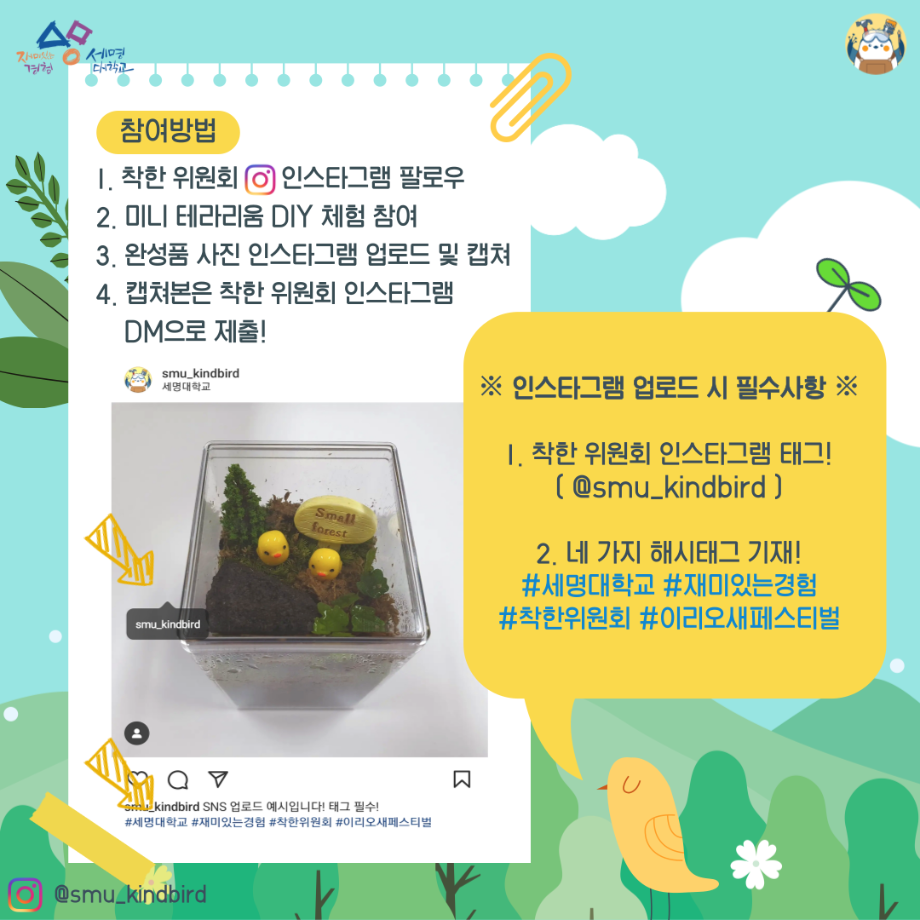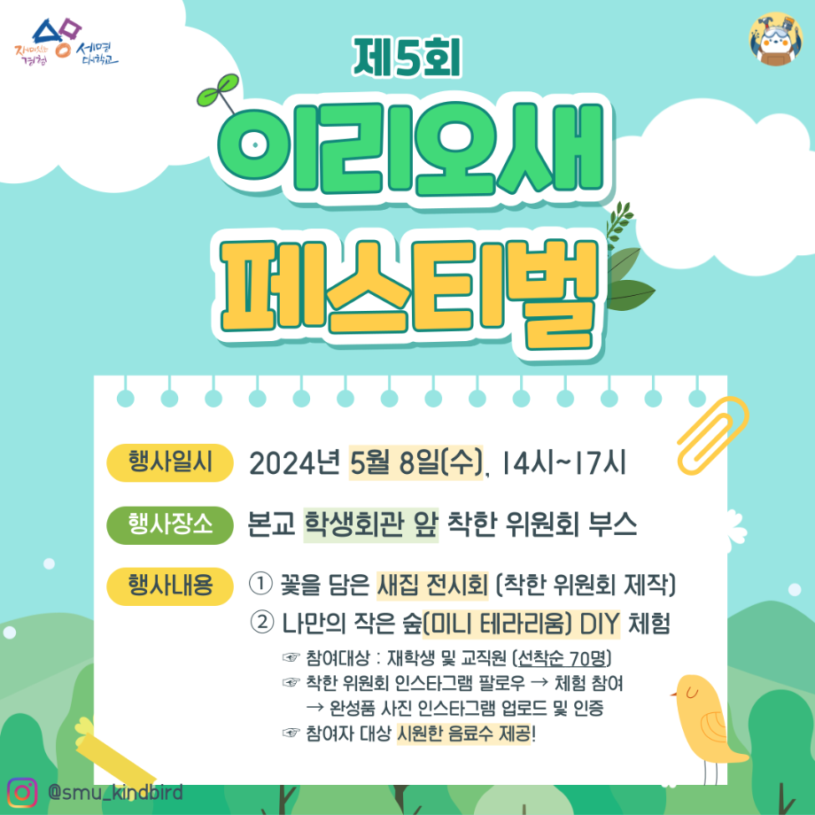 본문 시작 홈으로 공지사항 학생위원회 개요 학생위원회 소개 공지사항 활동결과 홈페이지가이드 프로그램 계획 프로그램 계획 세명대학교 공지사항 프로그램 계획 페이스북 트위터 프린트 [착한 위원회]제5회 이리오새 페스티벌 학생처 1886 2024-05-08 [착한 위원회] 제5회 이리오새 페스티벌 1. 행사일시 : 2024년 5월 8일(수), 14시~17시 2. 행사장소 : 본교 학생회관 앞 착한 위원회 부스 3. 행사내용 - 꽃을 담은 새집 전시회 (착한 위원회 제작) - 나만의 작은 숲(미니 테라리움) DIY 체험 (선착순 70명, 참여자 대상 시원한 음료 제공) 목록 다음 [꽃피는 위원회] 행운을 가져다주는 책갈피 만들기 다음 [생각하는 위원회] 하이드 북 담당부서 : 장학복지팀 담당자 : - 연락처 : 043-649-1142 최종수정일 : 2024-10-26 만족도조사 만족도 조사 이 페이지에서 제공하는 정보에 대하여 만족하시나요? 매우만족 만족 보통 불만족 매우불만족