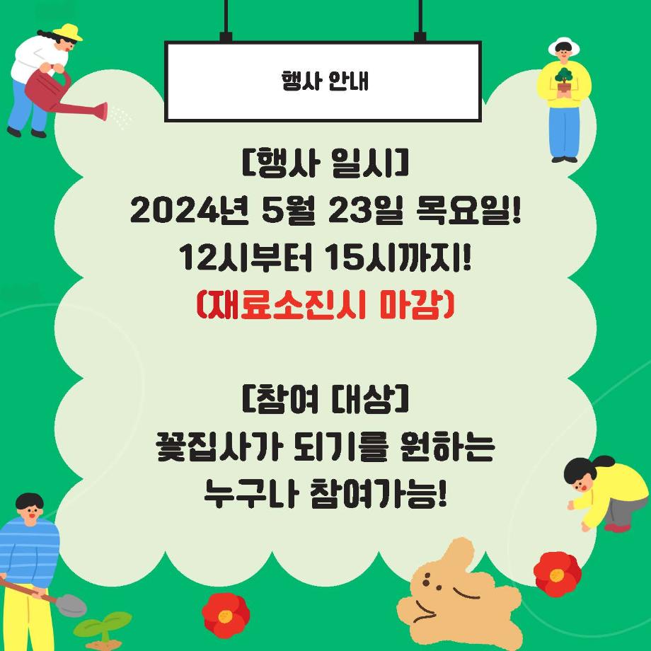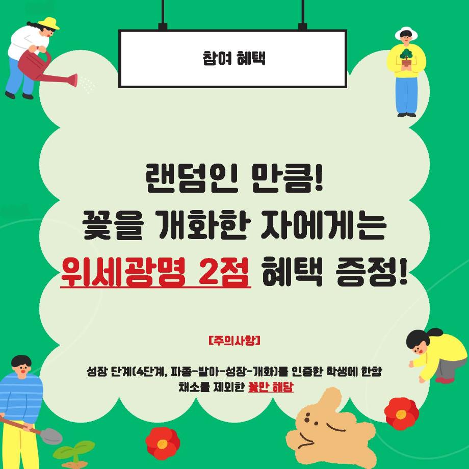 본문 시작 홈으로 공지사항 학생위원회 개요 학생위원회 소개 공지사항 활동결과 홈페이지가이드 프로그램 계획 프로그램 계획 세명대학교 공지사항 프로그램 계획 페이스북 트위터 프린트 [꽃피는 위원회] 제 3회 사랑의 꽃집사 체험이벤트 학생처 1413 2024-05-23 꽃피는 위원회 장기프로젝트 [사랑의 꽃집사 체험이벤트]가 돌어왔습니다. 꽃집사, 식집사가 되고싶은 본교 구성원들의 많은 참여부탁드립니다. 일시 : 2024.05.23(목) 12시~15시 장소 : 학생회관 앞 광장 내 행사부스 참여방법 : 행사부스에 방문하여 복불복 룰렛을 돌려 씨앗을 결정한 후 준비된 재료로 씨앗을 심기 (꽃씨앗에 한해 성장4단계를 인증하는 재학생에게 위세광명포인트 2점 지급) 목록 다음 [생각하는 위원회] 하이드 북 이전[약속하는 위원회] 약속마켓 물품기부자 모집 담당부서 : 장학복지팀 담당자 : - 연락처 : 043-649-1142 최종수정일 : 2024-10-26 만족도조사 만족도 조사 이 페이지에서 제공하는 정보에 대하여 만족하시나요? 매우만족 만족 보통 불만족 매우불만족