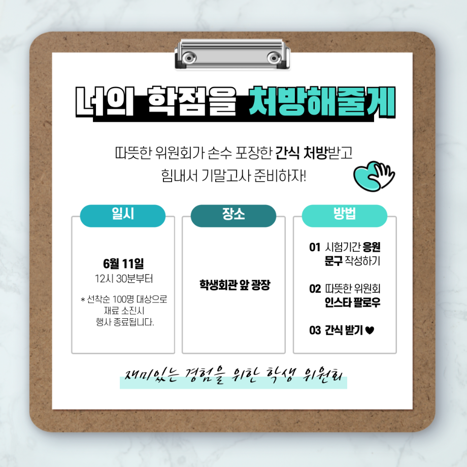 어느덧 기말고사 시험이 다가오고 있는데요! 작년에 이어 올해도 여러분의 시험 준비에 힘이 되어드리기 위해 따뜻한 위원회가 간식을 준비했습니다!