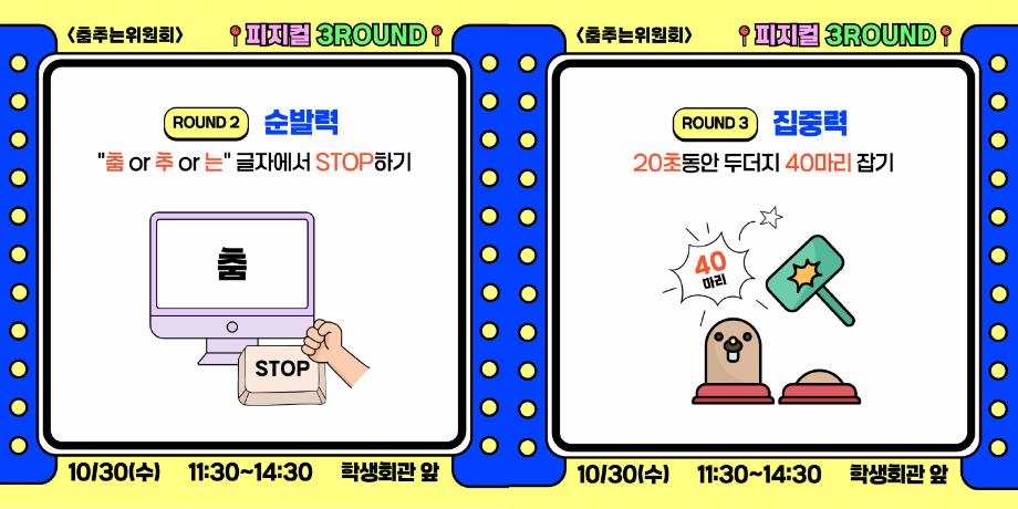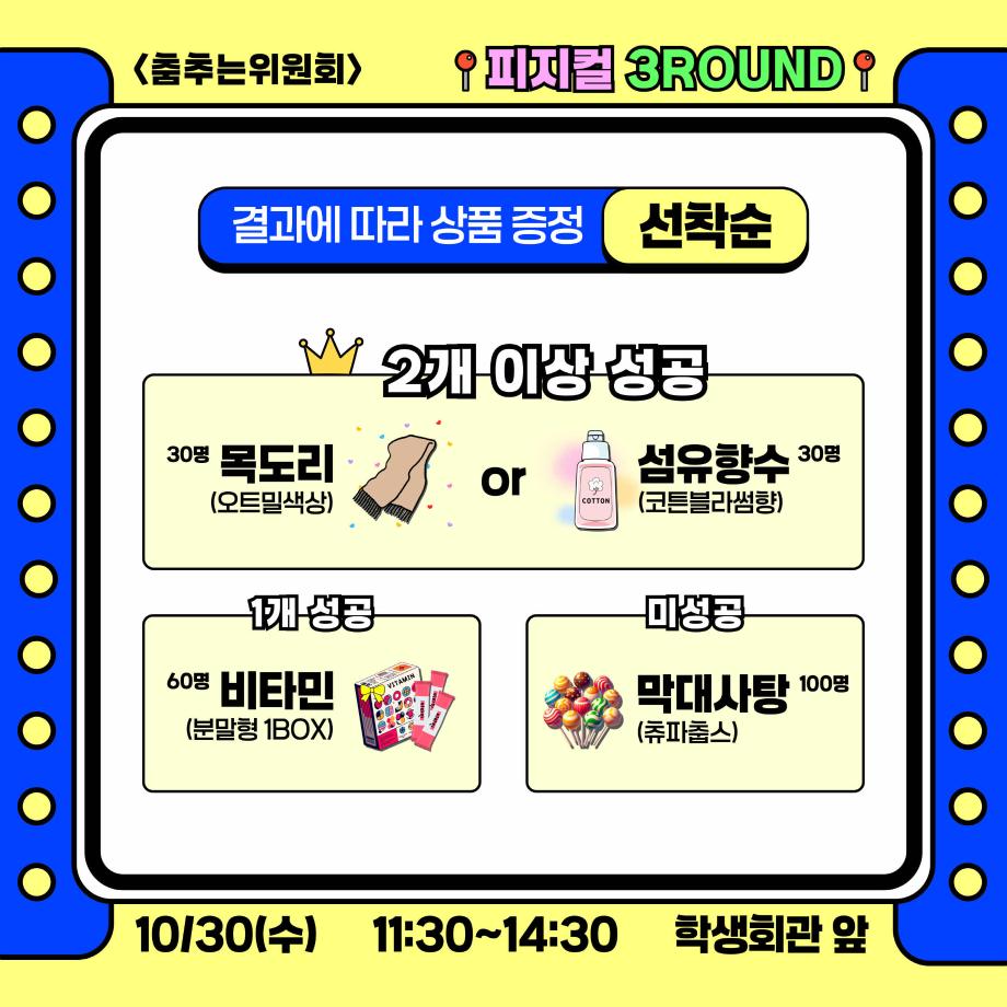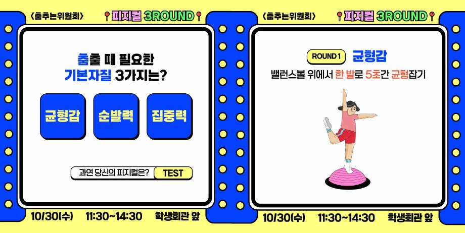 본문 시작 홈으로 공지사항 학생위원회 개요 학생위원회 소개 공지사항 활동결과 홈페이지가이드 프로그램 계획 프로그램 계획 세명대학교 공지사항 프로그램 계획 페이스북 트위터 프린트 [춤추는 위원회]피지컬3ROUND 학생처 1366 2024-10-30 [춤추는 위원회] 피지컬3ROUND 춤출 때 필요한 기본자질테스트 1. 균형감 : 밸런스볼 위에서 한발로 5초간 균형잡기 2. 순발력 : 춤OR 추OR 는 글자에서 STOP하기 3. 집중력 : 20초동안 두더지 40만리 잡기 참여결과에 따라 상품증정(선착순)하니 많은 참여부탁드립니다. 목록 이전-용감한 위원회] 도전! 인테리어창업 다음 [벗어나는 위원회] 벗어나는 위원회와 함께하는 스트레스를 벗어나자! 담당부서 : 장학복지팀 담당자 : - 연락처 : 043-649-1142 최종수정일 : 2024-10-26 만족도조사 만족도 조사 이 페이지에서 제공하는 정보에 대하여 만족하시나요? 매우만족 만족 보통 불만족 매우불만족