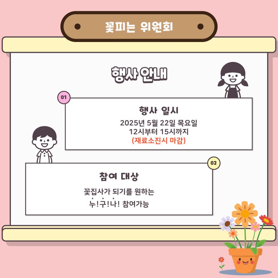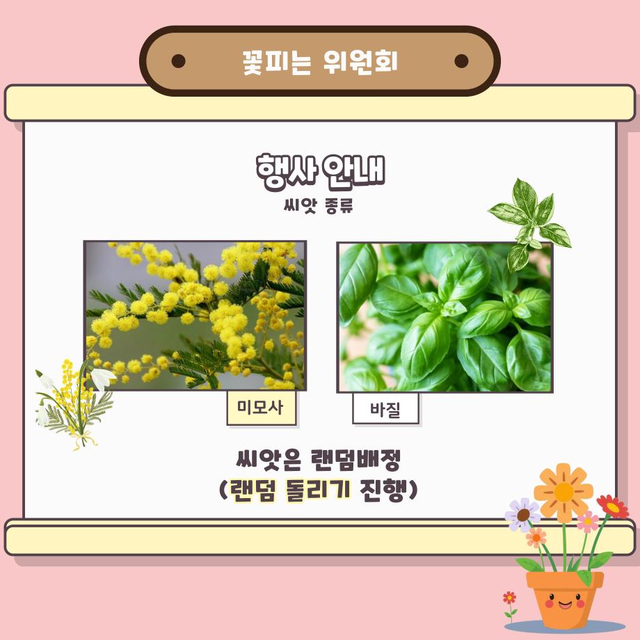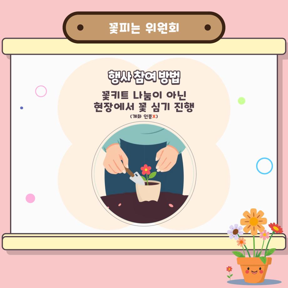 본문 시작 홈으로 공지사항 학생위원회 개요 학생위원회 소개 공지사항 활동결과 홈페이지가이드 프로그램 계획 프로그램 계획 세명대학교 공지사항 프로그램 계획 페이스북 트위터 프린트 [꽃피는 위원회] 제4회 사랑의 꽃집사 이벤트 학생처 1177 2025-05-22 제 4회 사랑의 꽃집사 체험이벤트 1. 일시: 2025.05.22 12시~15시 2. 장소: 학생회관 앞 광장 3. 대상: 본교 구성원 100명 한정 4. 씨앗종류: 미모사, 바질, 버베나 목록 이전[착한 위원회] 포근한 한 송이 이전[약속하는 위원회] 달려라, 에코레이서 담당부서 : 장학복지팀 담당자 : - 연락처 : 043-649-1142 최종수정일 : 2024-10-26 만족도조사 만족도 조사 이 페이지에서 제공하는 정보에 대하여 만족하시나요? 매우만족 만족 보통 불만족 매우불만족
