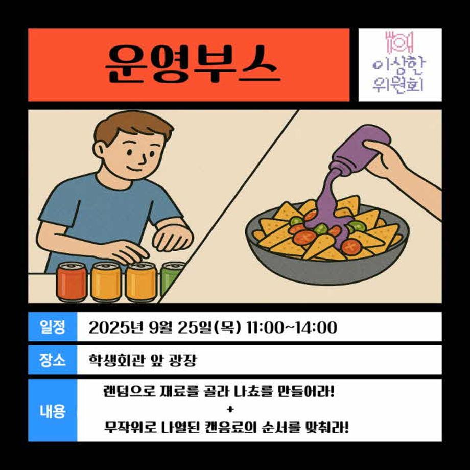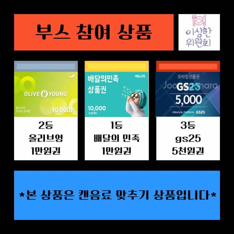 본문 시작 홈으로 공지사항 학생위원회 개요 학생위원회 소개 공지사항 활동결과 홈페이지가이드 프로그램 계획 프로그램 계획 세명대학교 공지사항 프로그램 계획 페이스북 트위터 프린트 [이상한 위원회] 유쾌하거나 불쾌하거나 학생처 516 2025-09-25 안녕하세요 🍽 이상한 위원회 🍽 입니다 청룡체전 기간 중 이상한 위원회에서 나쵸 만들기와 캔 위치 맞히기 게임을 진행하는 홍보 부스를 운영합니다! 🍭 이상한 위원회 인스타도 팔로우 하고 재미있는 경험하고 가세요🤗 ✅ 선착순 150명 ✅ 일시: 2025. 9. 25.(목) ✅ 시간: 11시~14시 ✅ 장소: 학생회관 앞 광장 많은 참여와 관심 부탁드립니다❤ 목록 이전[용감한 창업자] 어떤 향이 좋아? 이전[밀어주는 위원회] 너의 꿈, 우리가 밀어줄게! 담당부서 : 장학복지팀 담당자 : - 연락처 : 043-649-1142 최종수정일 : 2024-10-26 만족도조사 만족도 조사 이 페이지에서 제공하는 정보에 대하여 만족하시나요? 매우만족 만족 보통 불만족 매우불만족
