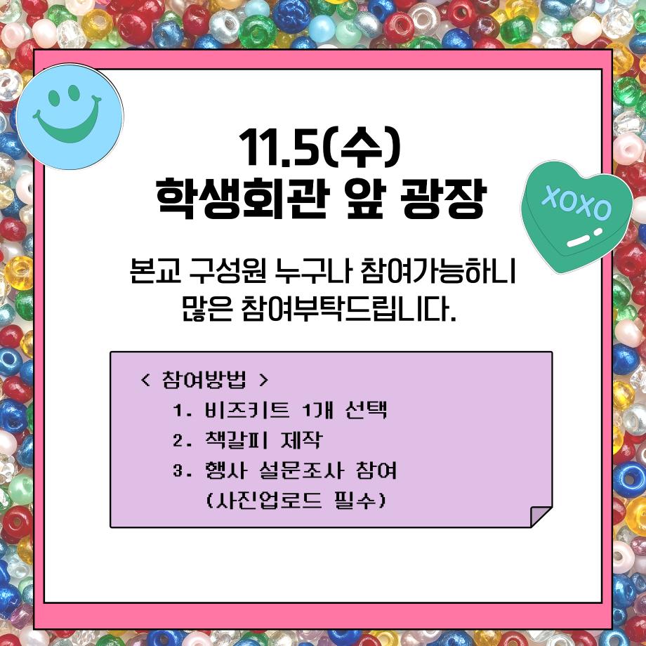 본문 시작 홈으로 공지사항 학생위원회 개요 학생위원회 소개 공지사항 활동결과 홈페이지가이드 프로그램 계획 프로그램 계획 세명대학교 공지사항 프로그램 계획 페이스북 트위터 프린트 [꽃피는 위원회] 북!마크!해버렸지뭐야 학생처 310 2025-11-05 꽃피는 위원회의 <비즈 책갈피 만들기> 행사명: 북!마크!해버렸지뭐야 행사일: 2025.11.05(수) 12시~15시 장 소: 학생회관 앞 광장 참여대상: 본교 구성원 선착순 100명 한정 많은 참여 부탁드립니다. 목록 이전[착한 위원회] 약과하나 주면 안잡아 먹지 다음 [맛있는 위원회] 얼죽아 모임에 초대합니다 담당부서 : 장학복지팀 담당자 : - 연락처 : 043-649-1142 최종수정일 : 2024-10-26 만족도조사 만족도 조사 이 페이지에서 제공하는 정보에 대하여 만족하시나요? 매우만족 만족 보통 불만족 매우불만족
