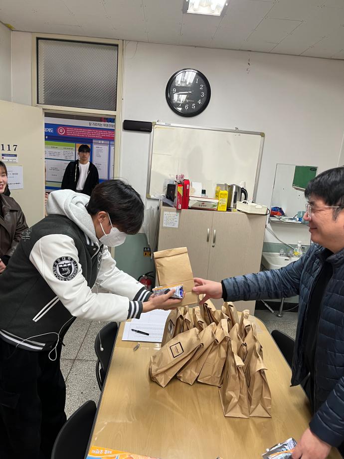 본문 시작 홈으로 커뮤니티 학과소개 교수소개 교육과정 커뮤니티 홈페이지가이드 포토갤러리 학과공지 학사일정 채용정보 및 자료 학생회 포토갤러리 포토갤러리 페이스북 트위터 프린트 책임지도교수 지도비 세네뜨리 빵 나눔 행사 진행 재난안전학과 84 2026-03-26 2026년 3월 26일(목) 오후 12시에 학과사무실(이공학관 117호)에서 작년 학기와 같이 세네뜨리아 빵(올리브롤치즈브레드+브라우니) 나눔 행사를 진행하였습니다. 재난안전학과 재학생들과 학과 교수님들간의 유대감을 형성하는 계기가 되었습니다. 목록 이전재난안전_3월 뉴스 만족도조사 만족도 조사 이 페이지에서 제공하는 정보에 대하여 만족하시나요? 매우만족 만족 보통 불만족 매우불만족