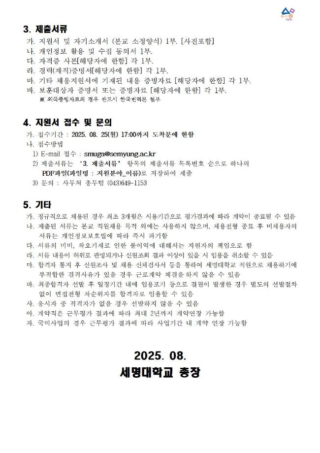 본문 시작 홈으로 커뮤니티 학과소개 교수소개 교육과정 커뮤니티 입학 정보 홈페이지가이드 취업/실습정보 학과공지 취업/실습정보 포토갤러리 취업/실습정보 페이스북 트위터 프린트 세명대학교 직원 채용 공고 [2025년 08월 25일 마감] 전기전자공학과 449 2025-08-14 목록 이전[(주)성풍건설] 채용 공고 다음 [알쓸신잡_2025년 8월 3주차] ●취업 및 일자리 정보 제공 안내문● 만족도조사 만족도 조사 이 페이지에서 제공하는 정보에 대하여 만족하시나요? 매우만족 만족 보통 불만족 매우불만족