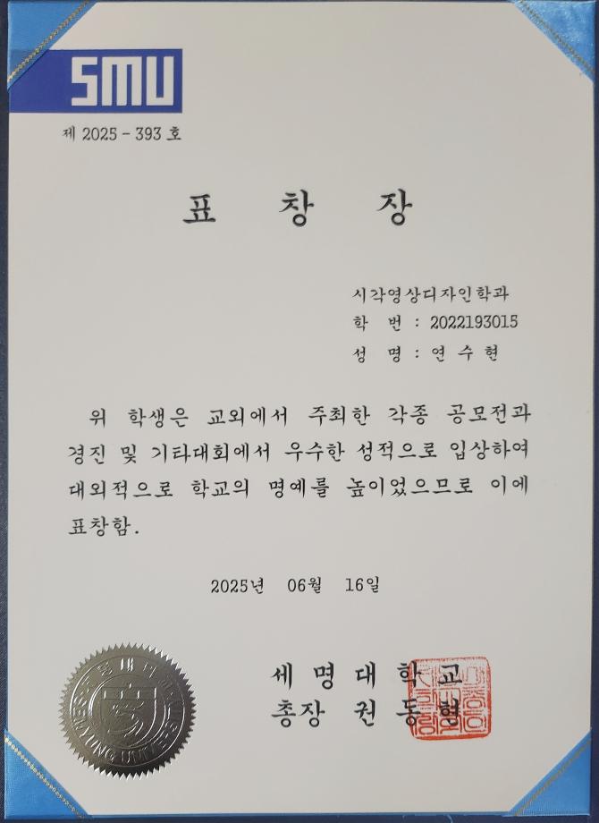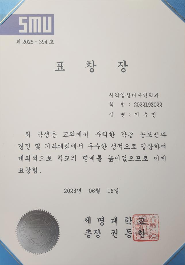 본문 시작 홈으로 학과자랑 학과소개 학과과정 시영소식 입학/취업 AI 학과자랑 SNS소통 홈페이지가이드 학과자랑 학과자랑 갤러리 공모전 동아리 졸업전시회 학과자랑 페이스북 트위터 프린트 2025년 총장표창장 수상 시각영상디자인학과 1176 2025-07-01 총장표창장 수상 - 이*민 연*현 문*빈 학생 시각영상디자인학과에서 3명이 수상하였습니다 모두 축하합니다 목록 이전충북과기원, 2025 충청북도 생성형 AI그림 그리기 경진대회- 신희경교수님 대상 수상 다음 2025 하계 현장실습 학생 인터뷰 - 세명네이처_박*준 담당부서 : 시각영상디자인학과 담당자 : - 연락처 : 043-649-1726 최종수정일 : 2024-10-26 만족도조사 만족도 조사 이 페이지에서 제공하는 정보에 대하여 만족하시나요? 매우만족 만족 보통 불만족 매우불만족