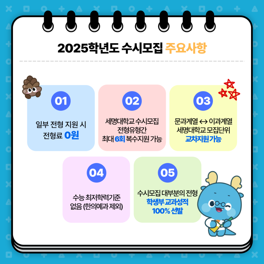 본문 시작 홈으로 MCC News 학과소개 교수소개 학과과정 MCC News MCC SNS 홈페이지가이드 미디어 정보통 학과 및 재학생 교수 및 졸업생 미디어 정보통 미디어 정보통 페이스북 트위터 프린트 📌 세명대학교 2025학년도 수시모집 주요사항 안내 📌 디지털콘텐츠창작학과 1774 2024-08-20 📌 세명대학교 2025학년도 수시모집 주요사항 안내 📌 예비 세명인들 주목~!!🔥 수시모집 주요사항부터 9월, 10월, 11월 일정까지! ✨세명대학교 2025학년도 수시모집 주요사항✨을 안내합니다👏 9월 9일부터 13일! 수시 원서 접수하고 💙재미있는 경험 가득한 세명대💙에서 만나요! 목록 이전2024학년도 2학기 한국장학재단 학자금대출 신청 안내 이전📌재학생맞춤형고용서비스 미래내일일경험 기업탐방캠프 신청 안내🎯 담당부서 : 미디어콘텐츠창작학과 담당자 : - 연락처 : 043-649-1741 최종수정일 : 2024-10-26 만족도조사 만족도 조사 이 페이지에서 제공하는 정보에 대하여 만족하시나요? 매우만족 만족 보통 불만족 매우불만족