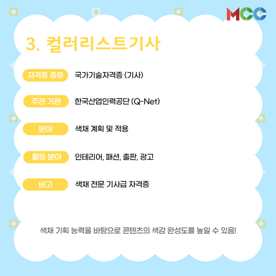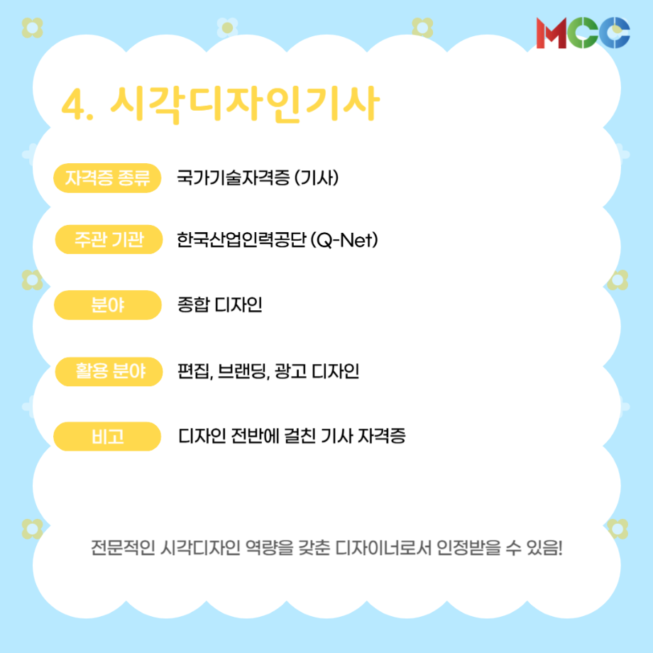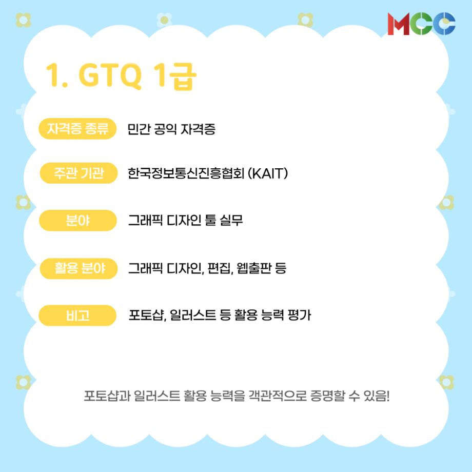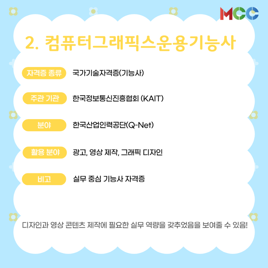 본문 시작 홈으로 MCC News 학과소개 교수소개 학과과정 MCC News MCC SNS 홈페이지가이드 미디어 정보통 학과 및 재학생 교수 및 졸업생 미디어 정보통 미디어 정보통 페이스북 트위터 프린트 미콘창 학생들을 위한 자격증 추천 리스트⭐ 미디어콘텐츠창작학과 1157 2025-06-27 방학 동안 자격증 준비를 해보는 건 어떨까요? 1. GTQ 1급 2. 컴퓨터그래픽스운용기능사 3. 컬러리스트기사 4. 시각디자인기사 5. ACA premiere pro 자세한 내용은 @smu_mcc 인스타그램에서 ! 목록 이전☀️“여름방학에 뭐 하지..?”☀️ 다음 2025 국제평화안보포럼인천 영상 콘텐츠 공모전 담당부서 : 미디어콘텐츠창작학과 담당자 : - 연락처 : 043-649-1741 최종수정일 : 2024-10-26 만족도조사 만족도 조사 이 페이지에서 제공하는 정보에 대하여 만족하시나요? 매우만족 만족 보통 불만족 매우불만족