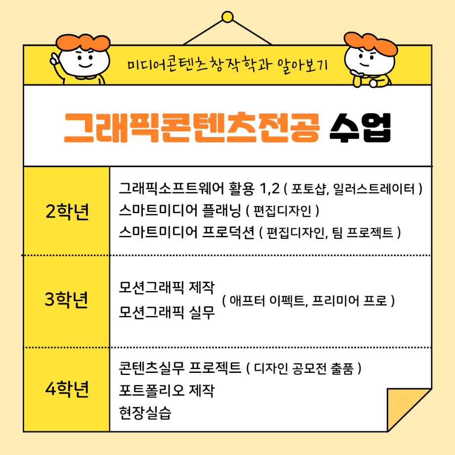 본문 시작 홈으로 MCC News 학과소개 교수소개 학과과정 MCC News MCC SNS 홈페이지가이드 미디어 정보통 학과 및 재학생 교수 및 졸업생 미디어 정보통 미디어 정보통 페이스북 트위터 프린트 🎨 미디어콘텐츠창작학과 | 그래픽 전공 미디어콘텐츠창작학과 1084 2025-09-10 그래픽 전공에서는 디자인의 기초부터 디지털 콘텐츠 제작까지 실무에 필요한 다양한 시각 표현 기술을 배웁니다. 학생들은 직접 작업물을 만들며 디자이너, 영상 그래픽 전문가, 콘텐츠 크리에이터로 성장할 수 있습니다. 목록 이전백억커피 x 곰믹스 AI 활용 영상 공모전 다음 2025학년도 2학기 원어민 교수와의 대화 담당부서 : 미디어콘텐츠창작학과 담당자 : - 연락처 : 043-649-1741 최종수정일 : 2024-10-26 만족도조사 만족도 조사 이 페이지에서 제공하는 정보에 대하여 만족하시나요? 매우만족 만족 보통 불만족 매우불만족