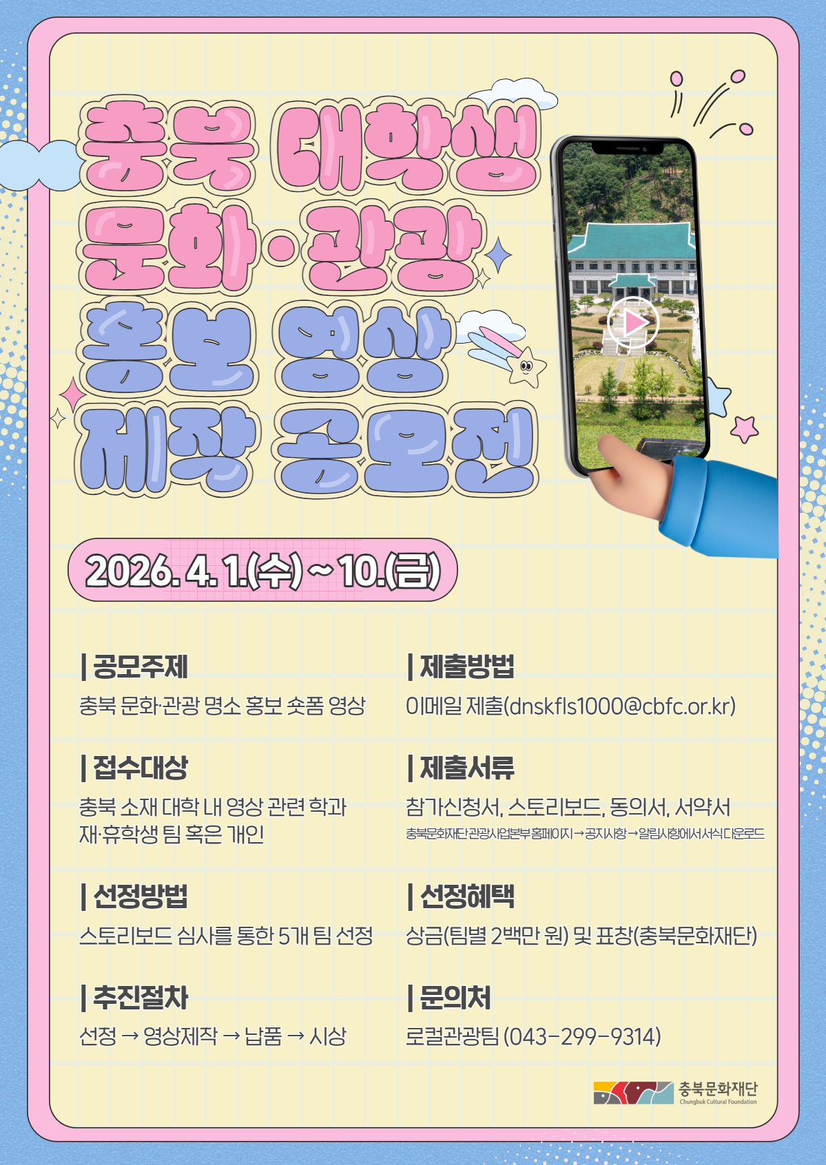 본문 시작 홈으로 학과소식 학과소개 교육과정 학과소식 학과작품 학과SNS 서울대학로 민송아트홀 홈페이지가이드 공모전 공지사항 학과뉴스 공모전 동아리 포토갤러리 공모전 페이스북 트위터 프린트 충북 대학생 문화·관광 홍보영상 제작 공모전 영화웹툰애니메이션학과 3 2026-04-02 목록 이전2026 AI 활용 글로벌 애니메이션 제작 인력 양성 사업 기업 및 인턴 모집 만족도조사 만족도 조사 이 페이지에서 제공하는 정보에 대하여 만족하시나요? 매우만족 만족 보통 불만족 매우불만족