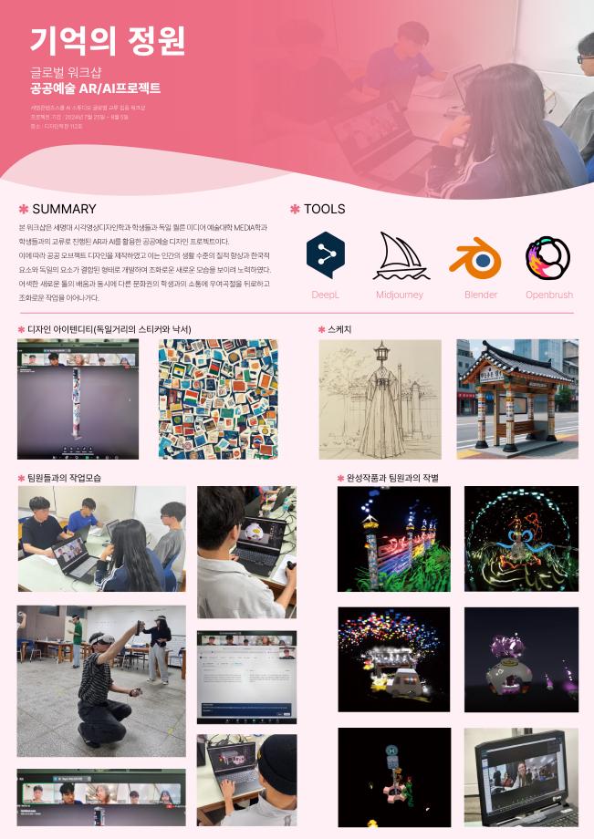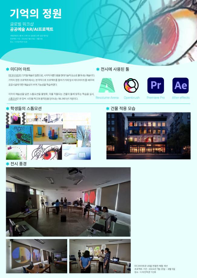 본문 시작 홈으로 AI 학과소개 학과과정 시영소식 입학/취업 AI 학과자랑 SNS소통 홈페이지가이드 AI 콘텐츠 연구소(AI 디자인) 디자인 정보 AI 콘텐츠 연구소(AI 디자인) AI 콘텐츠 연구소(AI 디자인) 페이스북 트위터 프린트 세명 AI 콘텐츠 연구소 - 세명 콘텐츠스쿨(SMCS) 가을 정기 전시회 시각영상디자인학과 781 2025-03-17 2024.12.4~12.13에 진행된 세명 콘텐츠스쿨(SMCS) 가을 정기 전시회에서 글로벌 워크샵 - 공공예술 AR/AI 프로젝트와 생성 AI 디자인 & 생성 AI 영상으로 세명 AI 콘텐츠 연구소가 참여, 전시하였습니다. 목록 이전세명 AI 콘텐츠 연구소 - 성과발표회 참여 다음 세명 AI 콘텐츠 연구소 - AI art & Design 만족도조사 만족도 조사 이 페이지에서 제공하는 정보에 대하여 만족하시나요? 매우만족 만족 보통 불만족 매우불만족