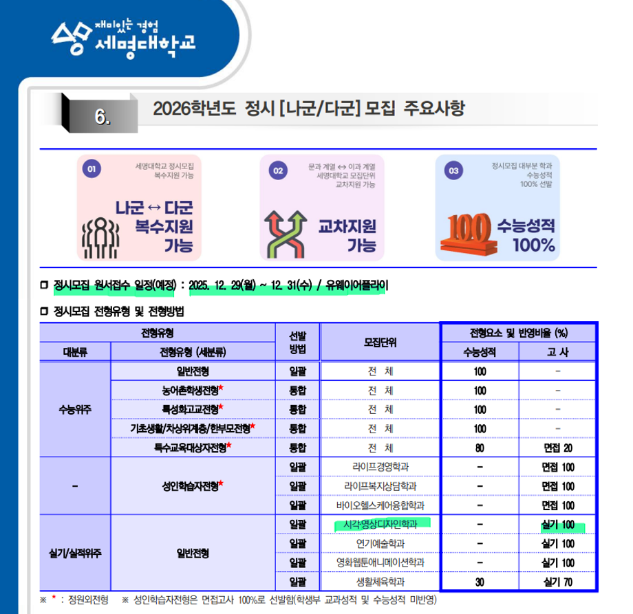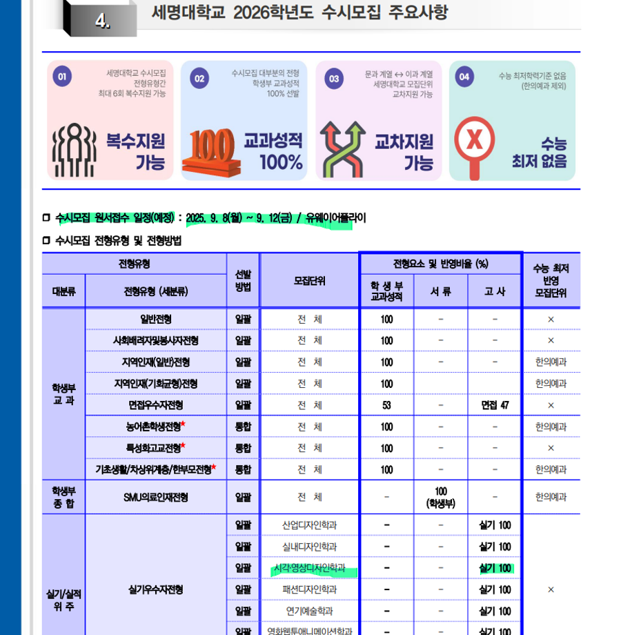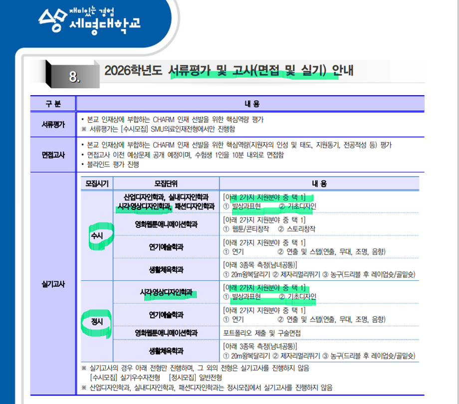 본문 시작 홈으로 입학/취업 학과소개 학과과정 시영소식 입학/취업 AI 학과자랑 SNS소통 홈페이지가이드 입학여기 입학여기 취업지금 전공소개 입학여기 페이스북 트위터 프린트 세명대학교_2026학년도 대학입학전형 시각영상디자인학과 2549 2025-03-12 세명대학교_2026학년도 대학입학전형 자세한 내용은 입학본부 공지 참고하세요 https://www.semyung.ac.kr/cop/bbs/BBSMSTR_000000000350/selectBoardArticle.do?nttId=366035&kind=&mno=sitemap_12&pageIndex=1&searchCnd=&searchWrd= 목록 이전2025 신입생 추가 모집 안내 다음 세명대학교_2026학년도 수시모집- 시각영상디자인학과 만족도조사 만족도 조사 이 페이지에서 제공하는 정보에 대하여 만족하시나요? 매우만족 만족 보통 불만족 매우불만족