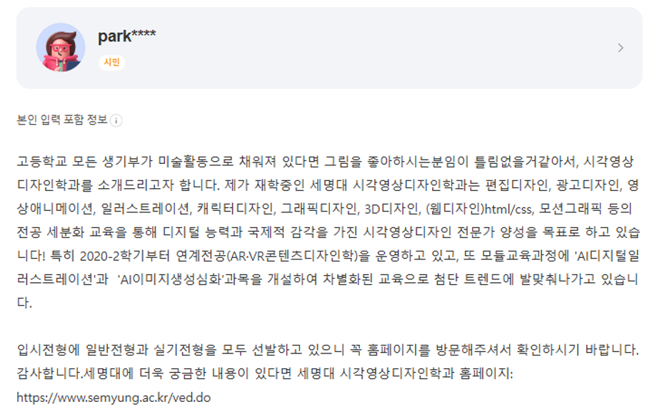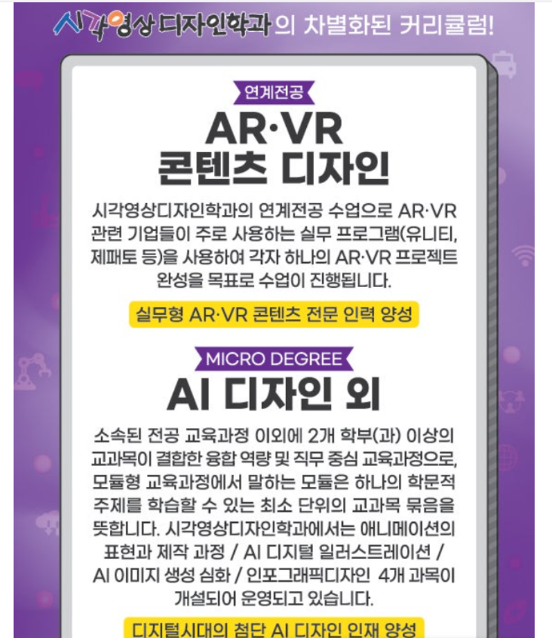 본문 시작 홈으로 입학/취업 학과소개 학과과정 시영소식 입학/취업 AI 학과자랑 SNS소통 홈페이지가이드 입학여기 입학여기 취업지금 전공소개 입학여기 페이스북 트위터 프린트 지식인 학과 답변 ->Q.시각디자인과... 시각영상디자인학과 1800 2024-09-08 지식인 학과 답변 ->Q.시각디자인과... 시각디자인과 : 지식iN (naver.com) http://namose_hyper.link/1726100292275https://www.youtube.com/watch?v=5ifKoX891yY&t=6s 시각영상디자인학과 소개영상! (youtube.com) 목록 이전2025 수시모집 원서접수 안내 다음 시각영상디자인학과 홍보동영상 만족도조사 만족도 조사 이 페이지에서 제공하는 정보에 대하여 만족하시나요? 매우만족 만족 보통 불만족 매우불만족