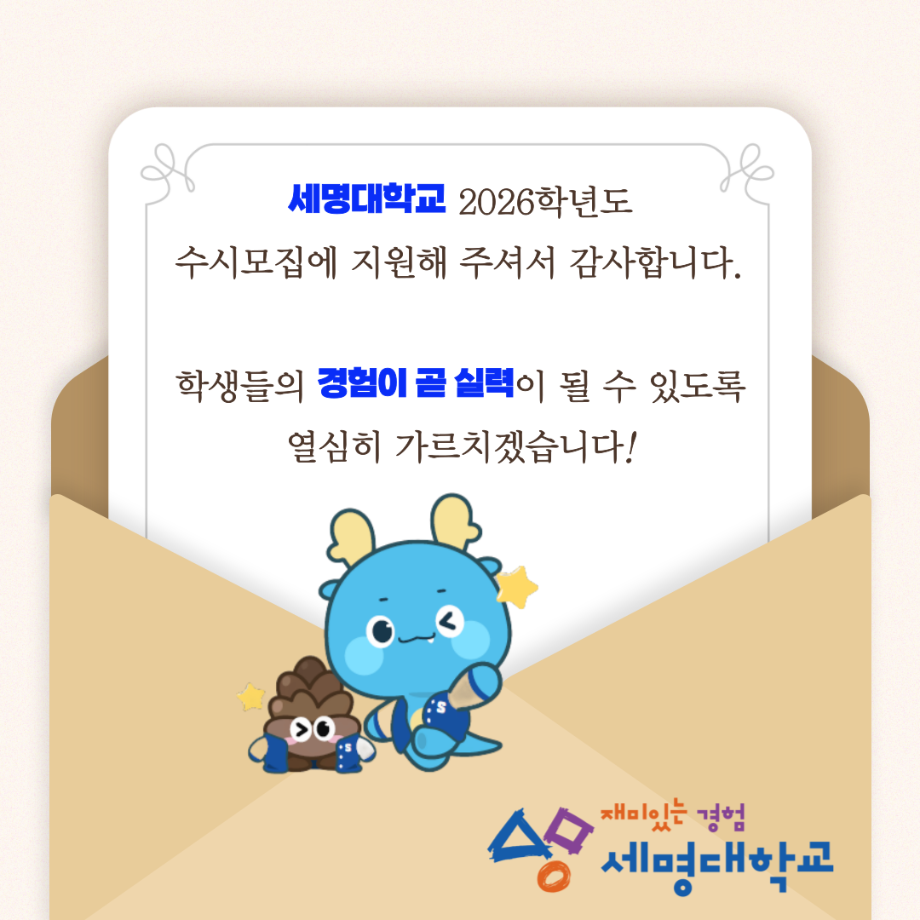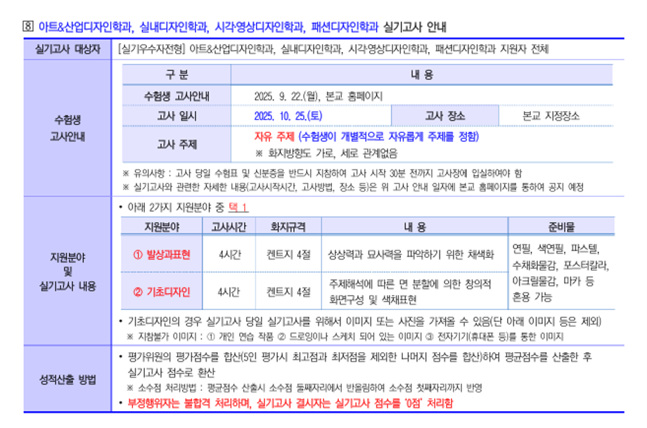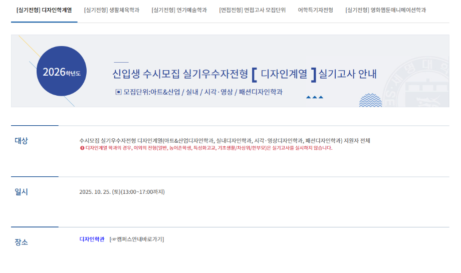 본문 시작 홈으로 입학/취업 학과소개 학과과정 시영소식 입학/취업 AI 학과자랑 SNS소통 홈페이지가이드 입학여기 입학여기 취업지금 전공소개 입학여기 페이스북 트위터 프린트 2026 수시모집 디자인계열학과 실기고사 안내 - 시각영상디자인학과 시각영상디자인학과 929 2025-10-01 2026 수시모집 디자인계열학과 실기고사 안내- 시각영상디자인학과 실기고사 안내 바로가기 > https://www.semyung.ac.kr/ipsi/sub01_07_03.do 목록 이전8월 12일 -중고등학생 대상 취업 특강- AI 브랜딩 다음 세명대학교_2026학년도 정시모집요강 만족도조사 만족도 조사 이 페이지에서 제공하는 정보에 대하여 만족하시나요? 매우만족 만족 보통 불만족 매우불만족