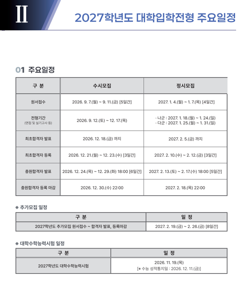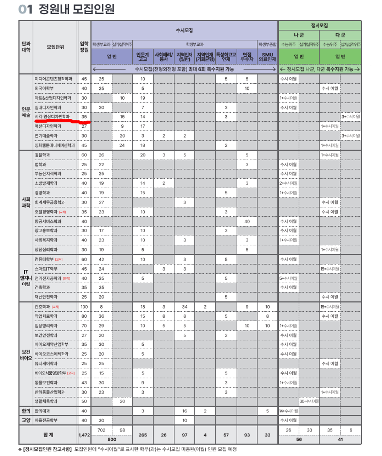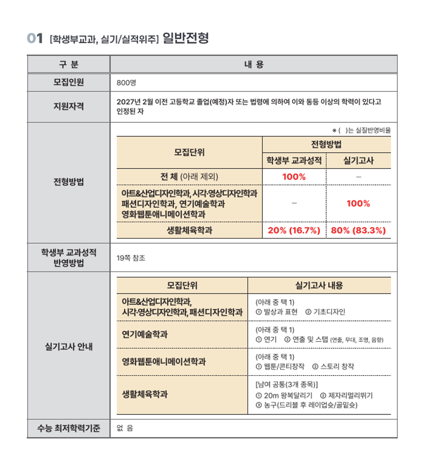 본문 시작 홈으로 입학/취업 학과소개 학과과정 시영소식 입학/취업 AI 학과자랑 SNS소통 홈페이지가이드 입학여기 입학여기 취업지금 전공소개 입학여기 페이스북 트위터 프린트 2027학년도 대학입학전형 시행계획 시각영상디자인학과 7 2026-04-03 본교 2027학년도 대학입학전형 시행계획입니다 첨부파일에 자세한 내용있으니 확인바랍니다~ https://www.semyung.ac.kr/cop/bbs/BBSMSTR_000000000350/selectBoardArticle.do?bbsId=BBSMSTR_000000000350&nttId=472634&bbsTyCode=&bbsAttrbCode=&kind=&mno=sitemap_12&pageIndex=1&searchCnd=&searchWrd= 목록 이전2026학년도 신입생 입학식 안내 만족도조사 만족도 조사 이 페이지에서 제공하는 정보에 대하여 만족하시나요? 매우만족 만족 보통 불만족 매우불만족