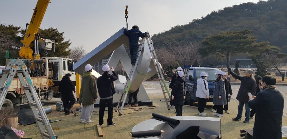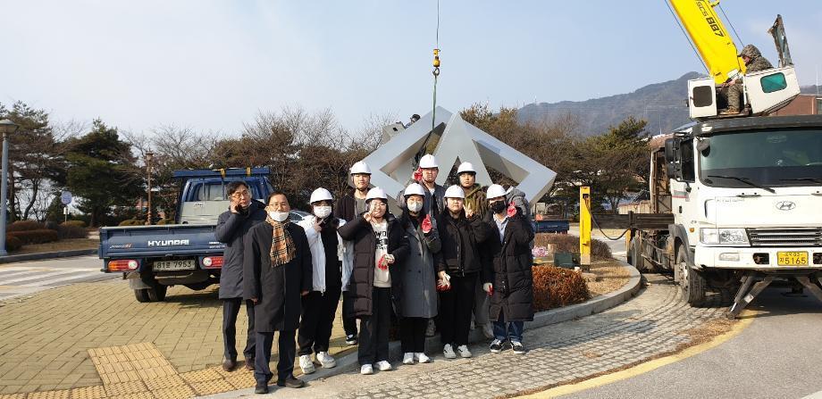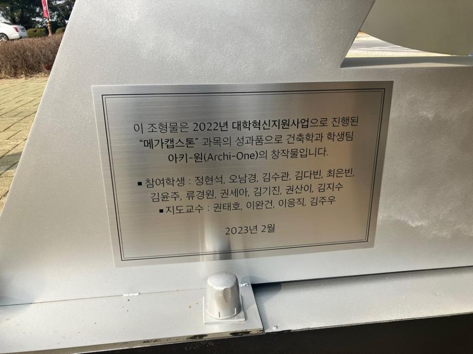 학교 동문(東門)에 설치된 본 조형물은 2022년 대학혁신지원사업으로 진행된 “메가캡스톤” 과목의 성과품으로 건축학 과 학생팀 아키-원(Archi-One)의 창작물이다. 겨울방학 동안 건축학과 학생들이 준비작업(팀원 간 아이스 브레이킹 등), 본 작업(주변지역 현장 조사, 작업방향 설정 및 조형 전문가 특강, 프로토 타입 제작 등), 검정 및 구축(현장 테스트 등)의 단계를 거치면서 조형물을 완성하였다. 결과물은 삼각형, 사각형, 원형의 구조물을 THK20mm SteelPlate를 아연 각 파이프 및 알곤 용접가공 등을 통해 완성 하였다. -참여학생 : 정현석, 오남경, 김수관, 김다빈, 최은빈, 김윤주, 류경원, 권세아, 김기진, 권산이, 김지수 -지도교수 : 권태호, 이완건, 이응직, 김주우