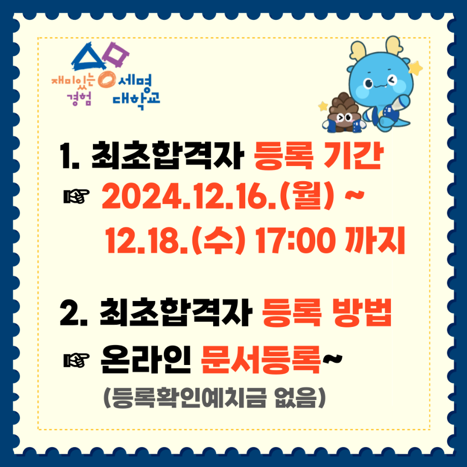 ① 수시모집 최종등록기간 : 2025.02.10.(월) 09:00 ~ 02.12.(수) 16:00 까지 [등록금 전액 납부]